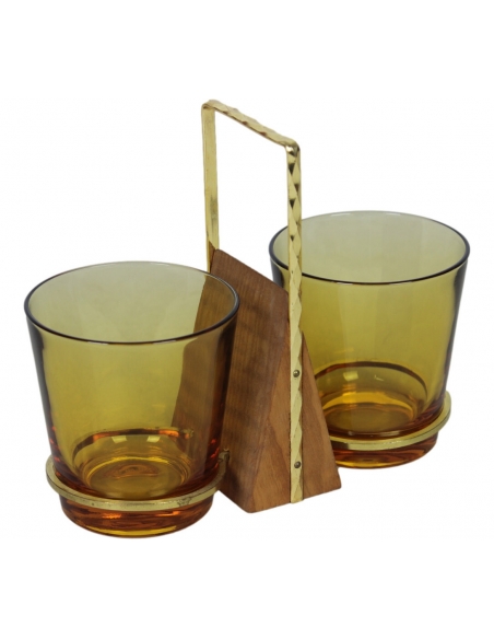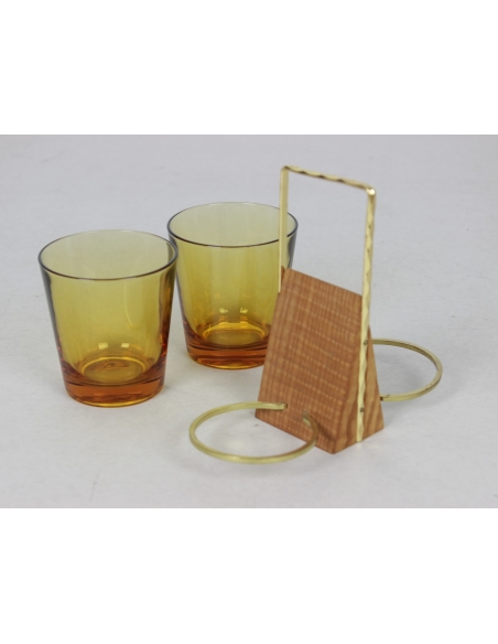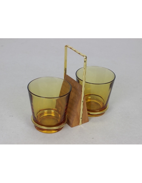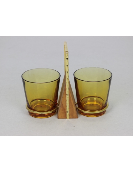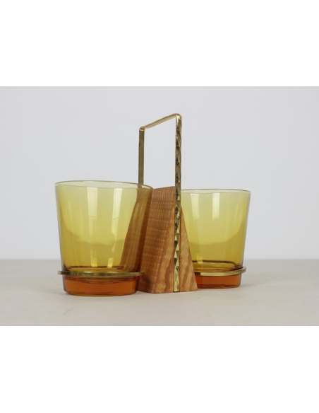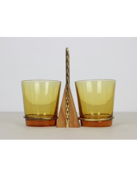 Szklane pojemniki na przyprawy pochodzące z lat 70. Umieszczone są w mosiężnych uchwytach.