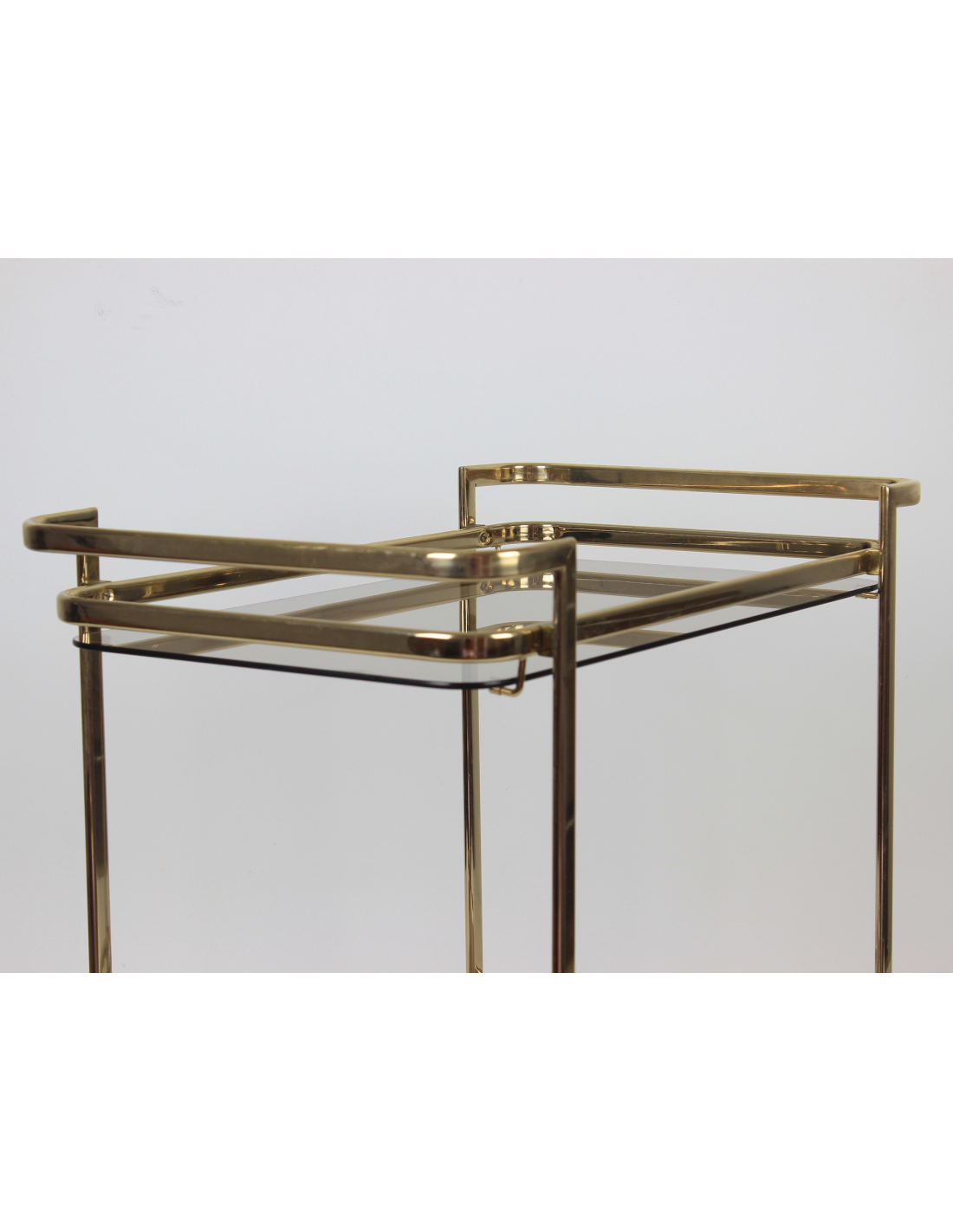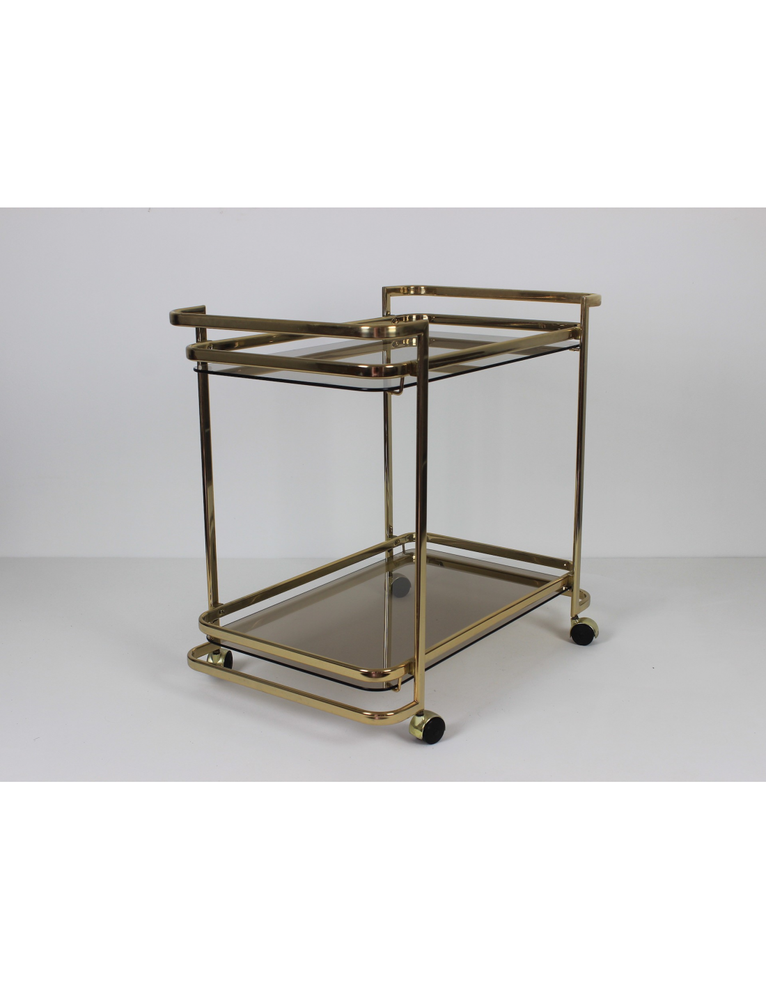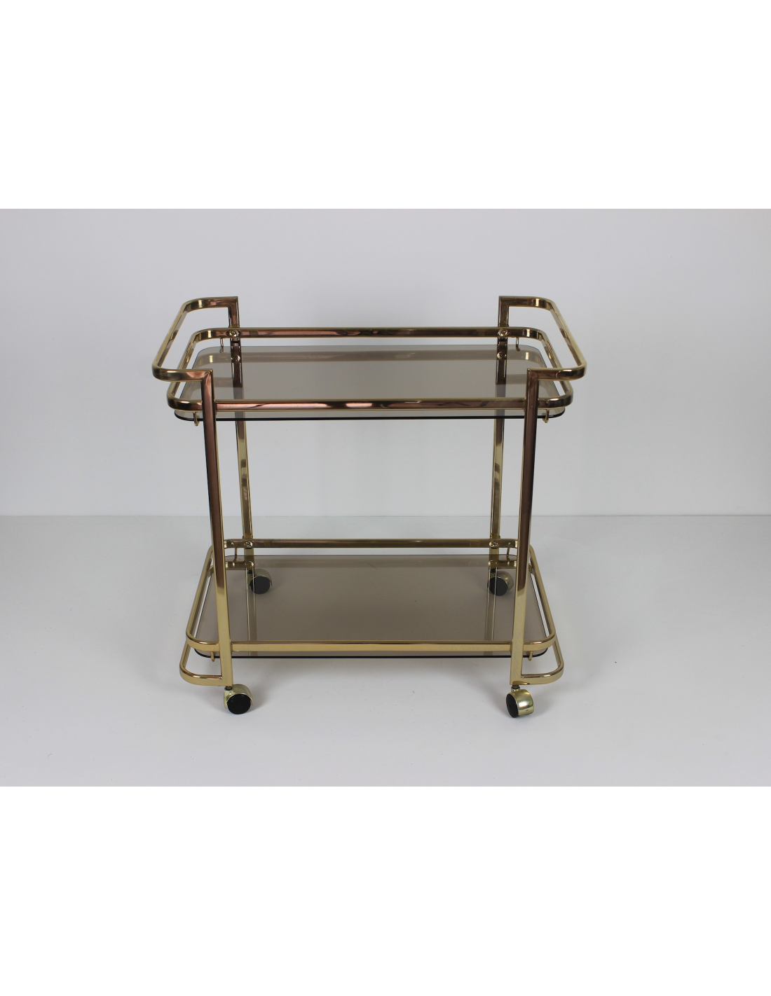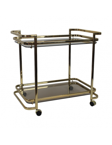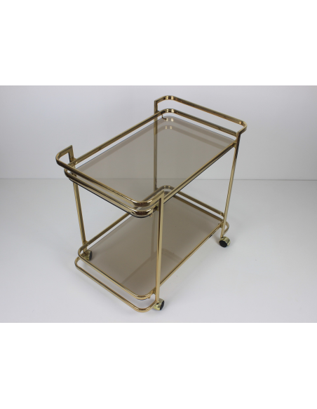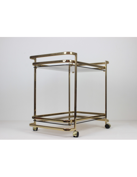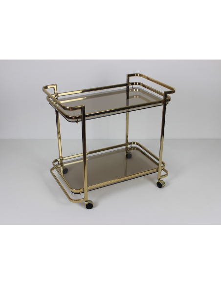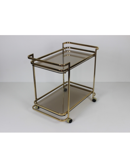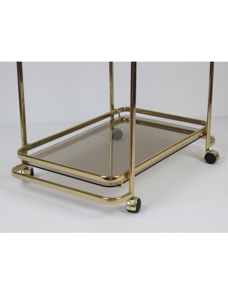 Wózek barowy wyprodukowany w latach 70. Wykonany jest z metalu w złotym kolorze. Posiada dwie szklane półki.