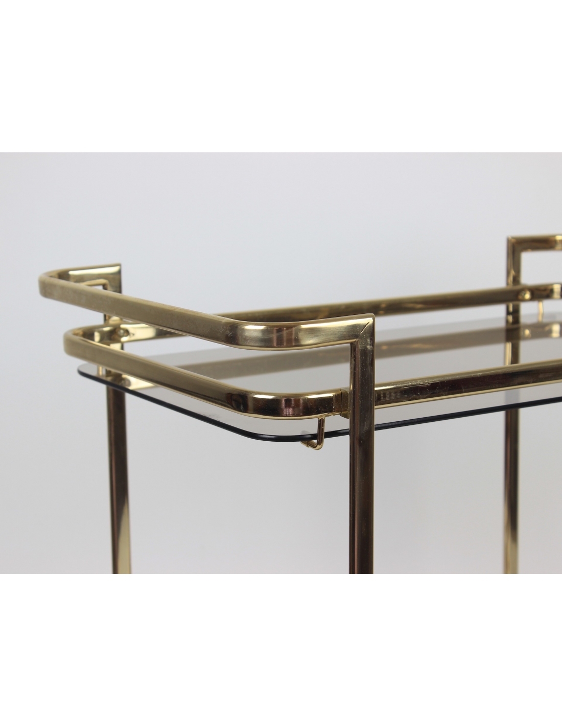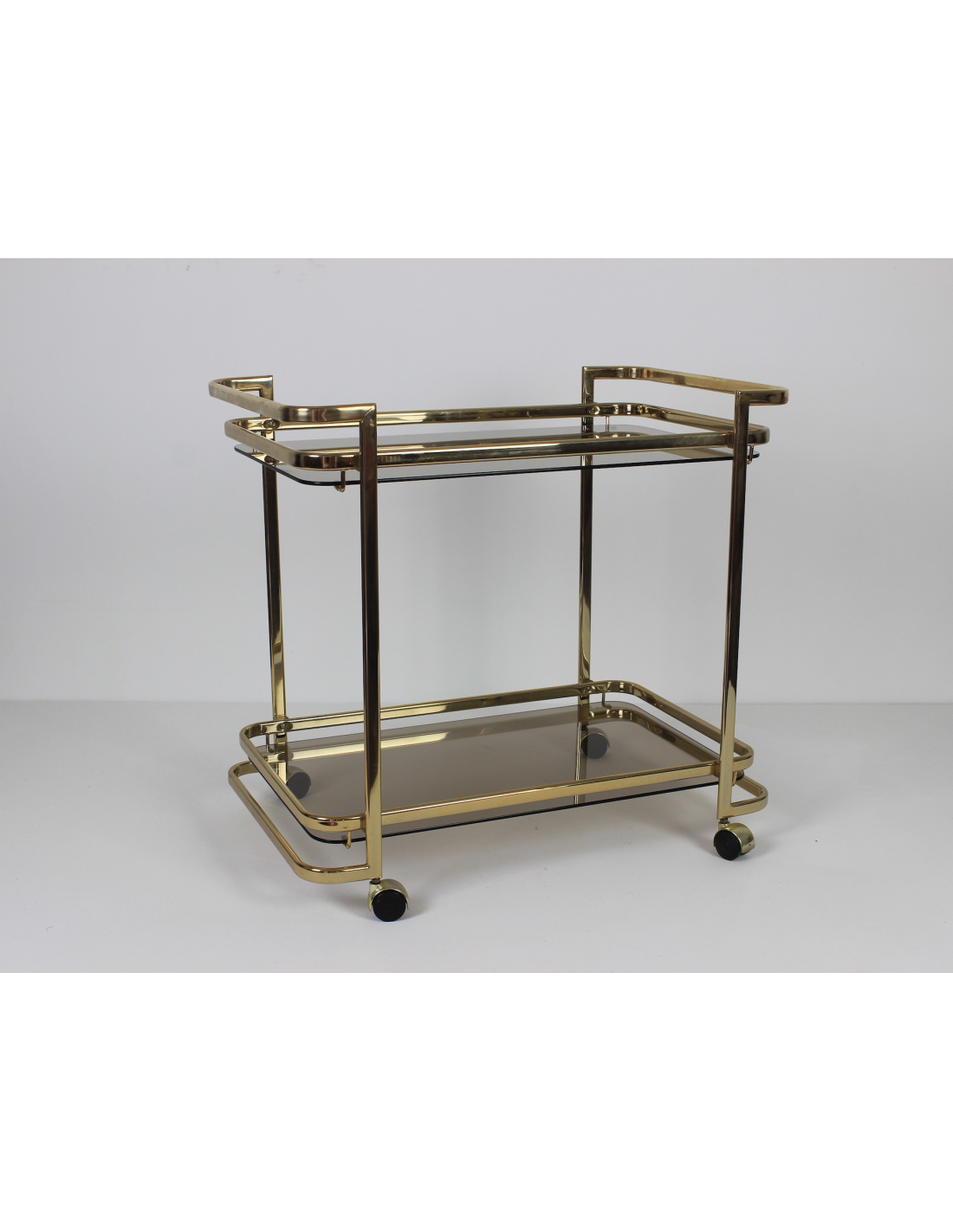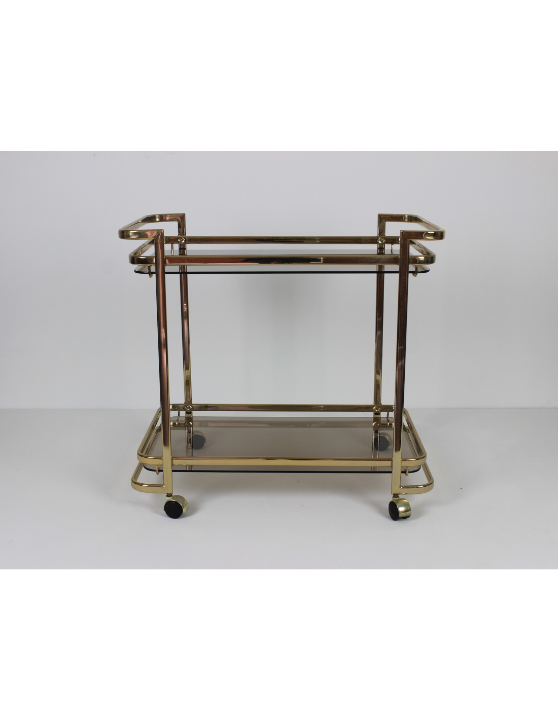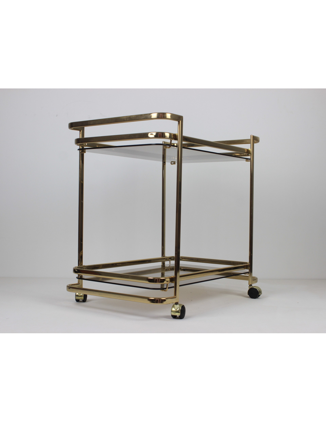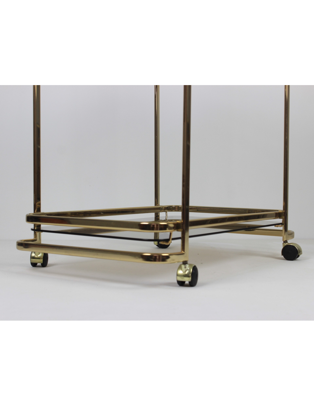 Wózek barowy wyprodukowany w latach 70. Wykonany jest z metalu w złotym kolorze. Posiada dwie szklane półki.