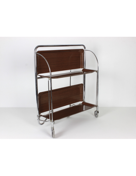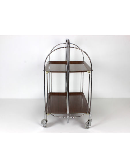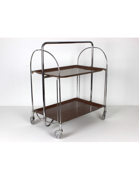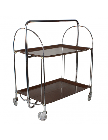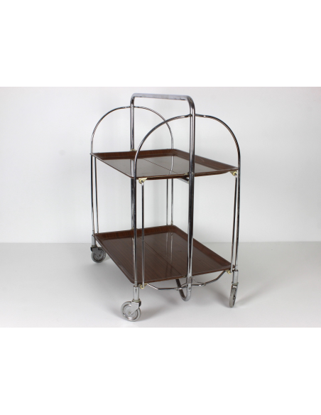 Składany barek pochodzący z lat 70. Stelaż wykonany jest z metalu chromowanego. Blaty z profilowanej sklejki, która została pokryta laminatem. Praktyczny i wygodny mebel w przechowywaniu.