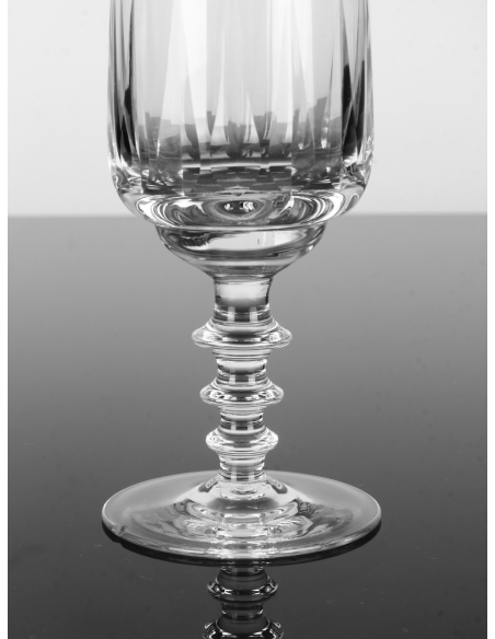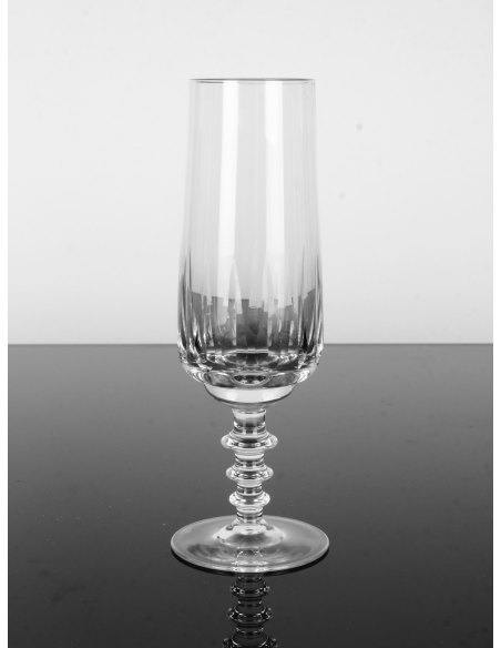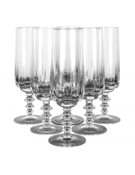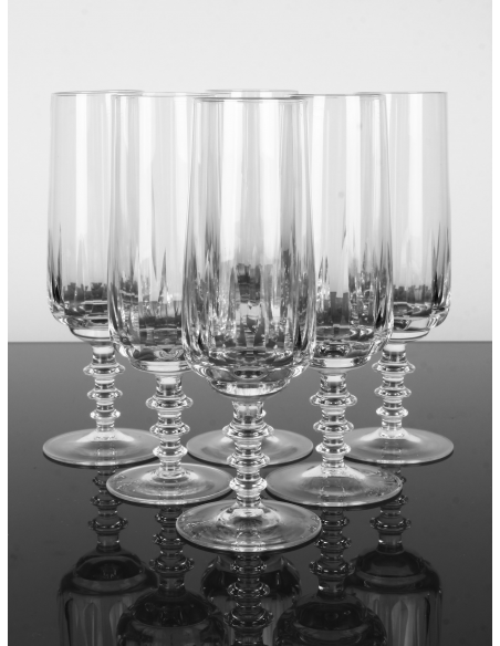 Komplet sześciu kryształowych kieliszków do szampana, pochodzących z lat 60. Podstawa jednego z kieliszków posiada minimalne wykruszenie. Defekt widoczny na zdjęciu.