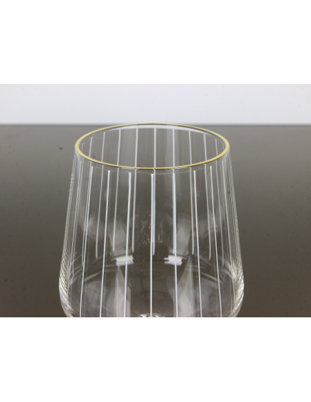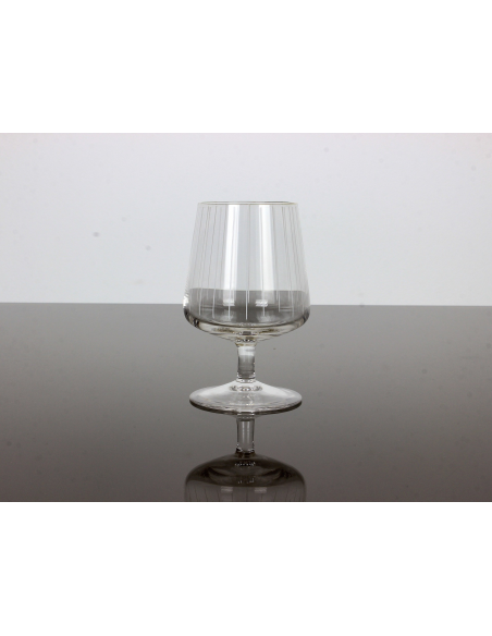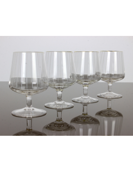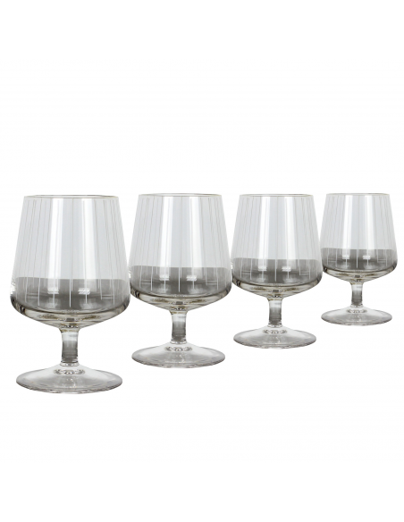 Komplet czterech kryształowych kieliszków do koniaku, pochodzących z lat 70. Czasza ozdobiona ręcznie malowanymi pionowymi białymi pasami, rant pozłacany.