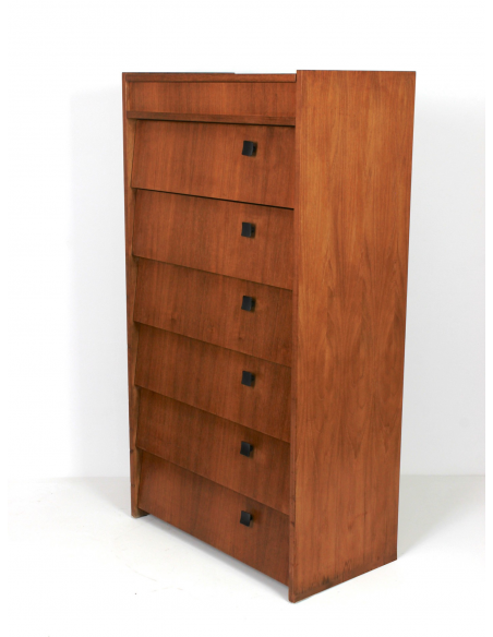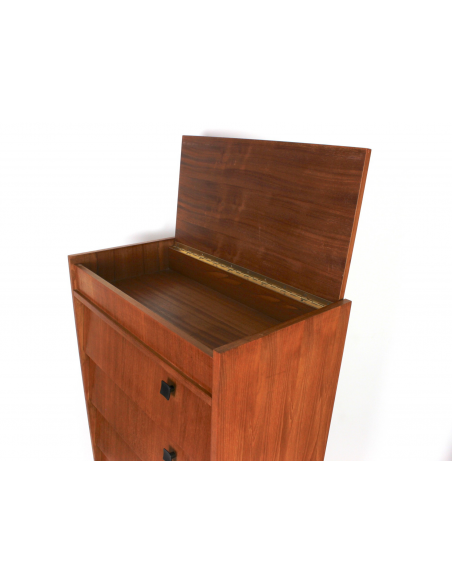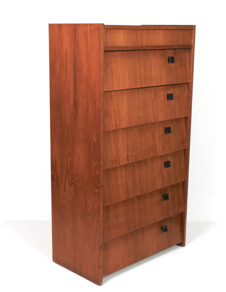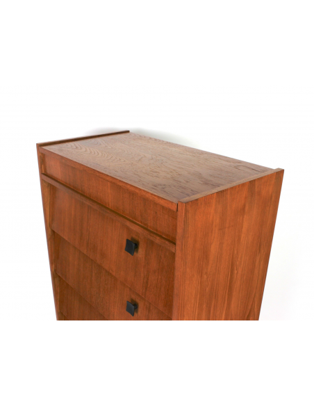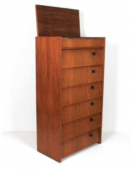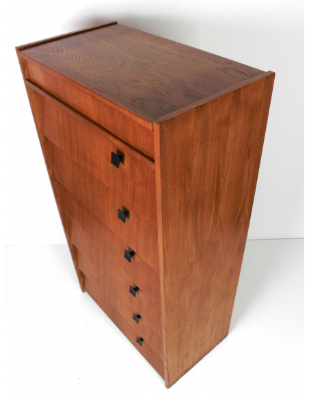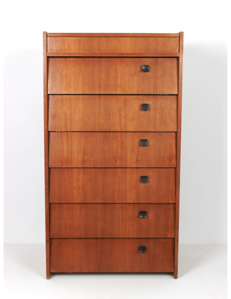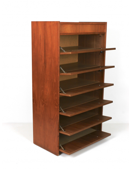 Skandynawska szafka tekowa, fornirowana drewnem tekowym. Wyprodukowana w latach 70. Posiada sześć półek z uchylnymi drzwiczkami oraz otwieraną od góry komorę. Szafka może służyć przede wszystkim do przechowywania butów. Niedoskonałości drewna, zaprezentowane na zdjęciach.