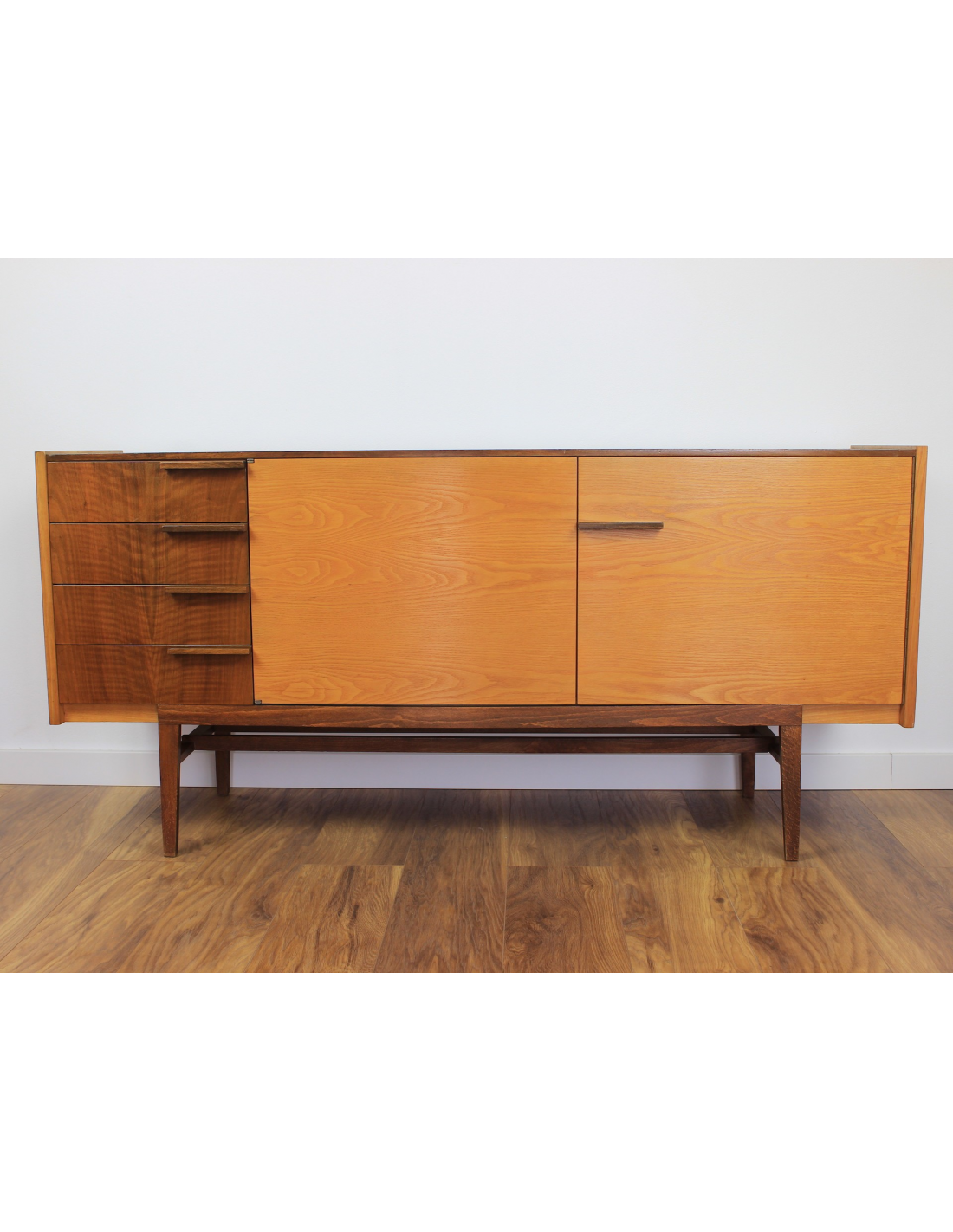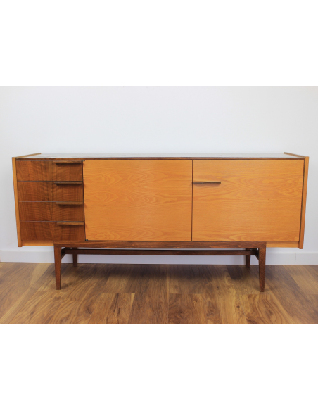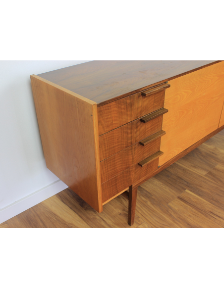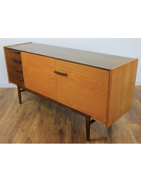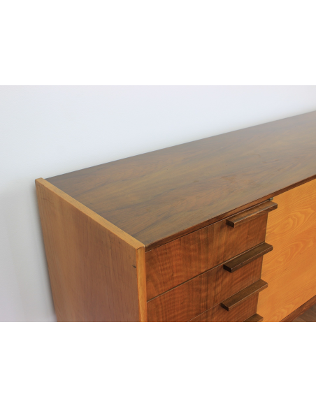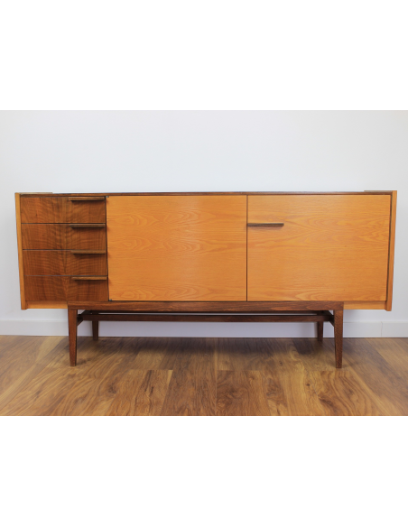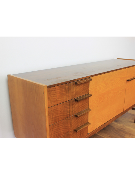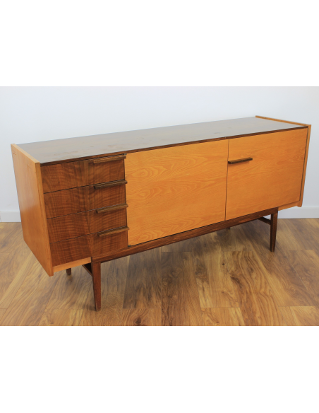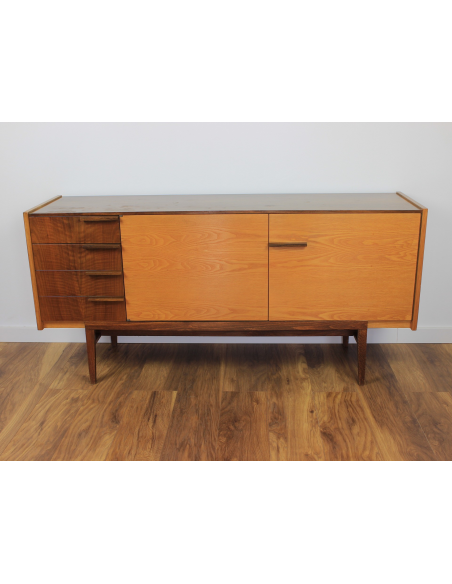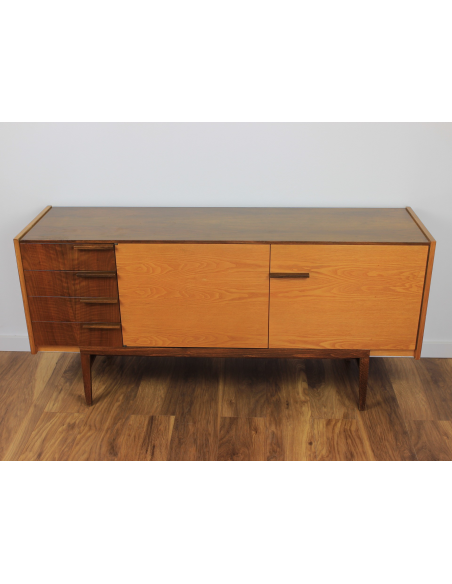 Komoda z lat 70. Wyprodukowana w Czechosłowacji w zakładach UP Zavody Bucovice, Prerov. Projekt Frantisek Mazulanik. Komoda posiada cztery szuflady i pojemną szafkę z trzema półkami, jedna w środkowej części, dwie w prawej części. Komoda w stanie oryginalnym, nie poddawana renowacji. Posiada na blacie niewielkie spękania bezbarwnego lakieru i ryski.
