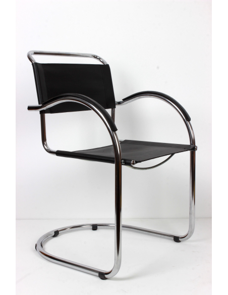 Krzesło pochodzące z lat 70. Konstrukcja - stal chromowana, siedzisko, oparcie i podłokietniki - skóra naturalna. Krzesło idealnie odnajdzie się w jadalni, salonie, poczekalni, biurze czy restauracji.