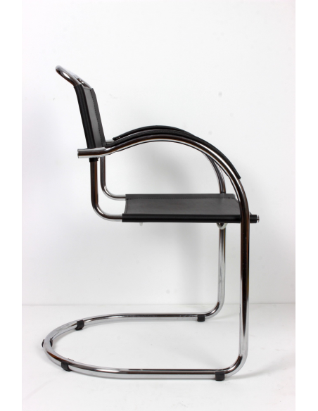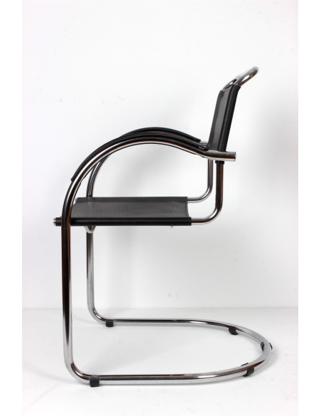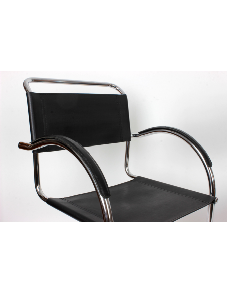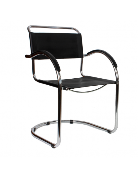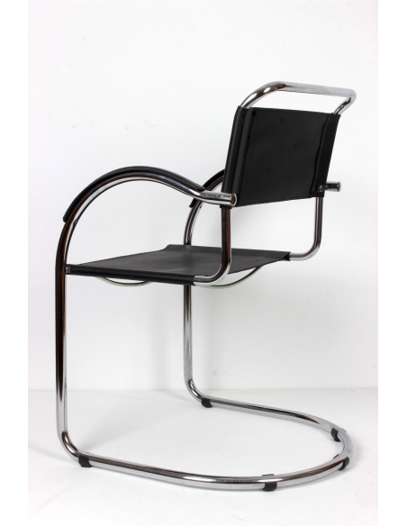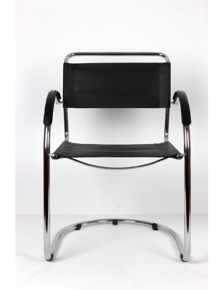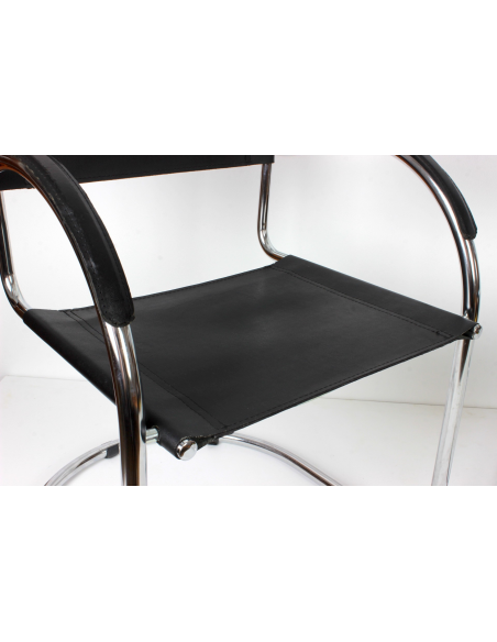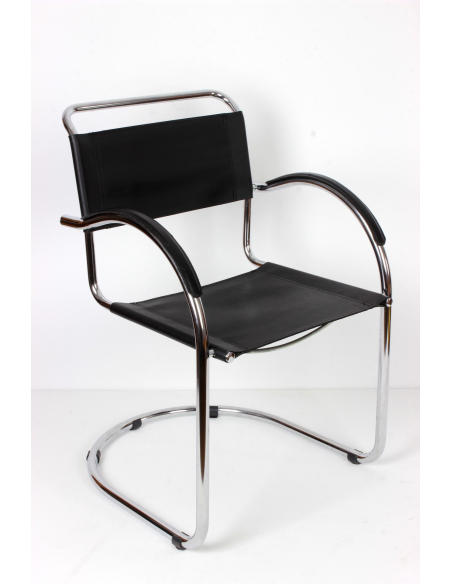 Krzesło pochodzące z lat 70. Konstrukcja - stal chromowana, siedzisko, oparcie i podłokietniki - skóra naturalna. Krzesło idealnie odnajdzie się w jadalni, salonie, poczekalni, biurze czy restauracji. Niewielkie niedoskonałości podłokietników w postaci spękań skóry.