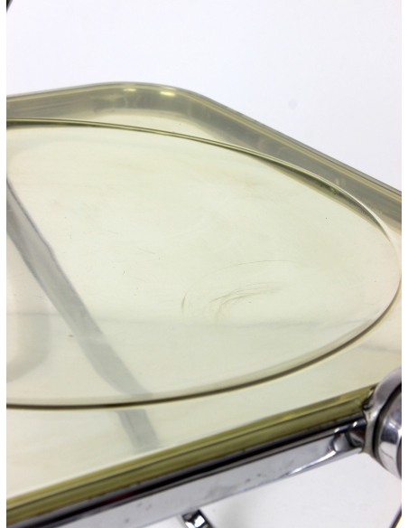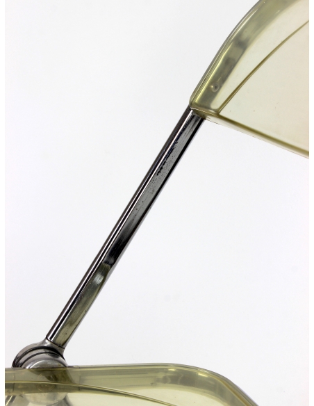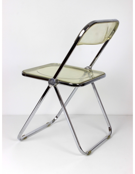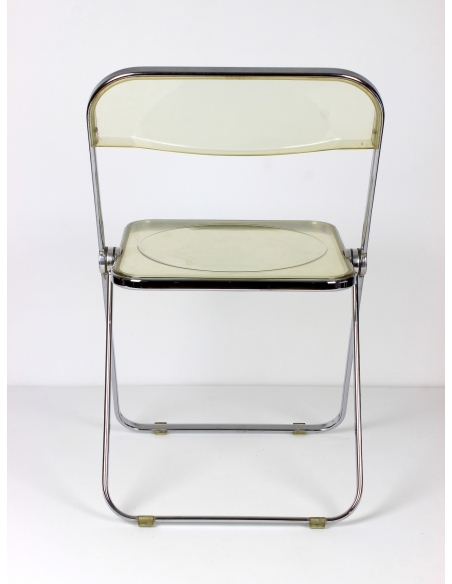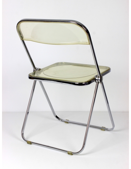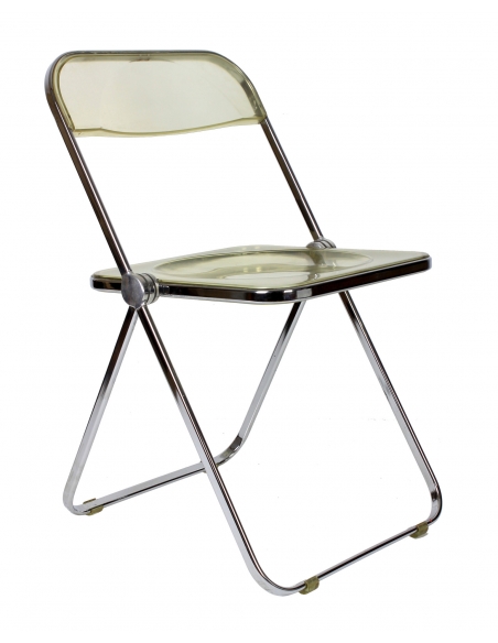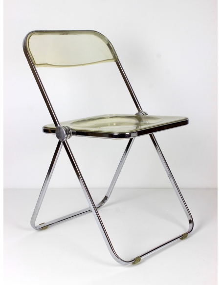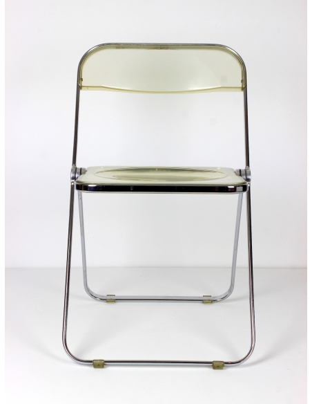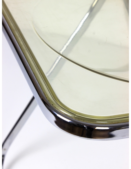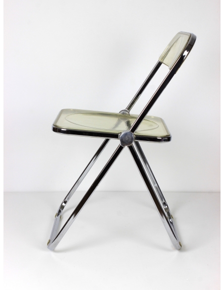 Krzesło, model Plia, zaprojektował Giancarlo Piretti dla manufaktury Castelii. Prezentowany egzemplarz pochodzi z Włoch i został wyprodukowany w latach 70. Konstrukcja to stal chromowana. Siedzisko i oparcie z transparentnego tworzywa. Krzesło składane. Posiada niedoskonałości chromu jak również rysy na siedzisku. Przypadłości widoczne na zdjęciach.
