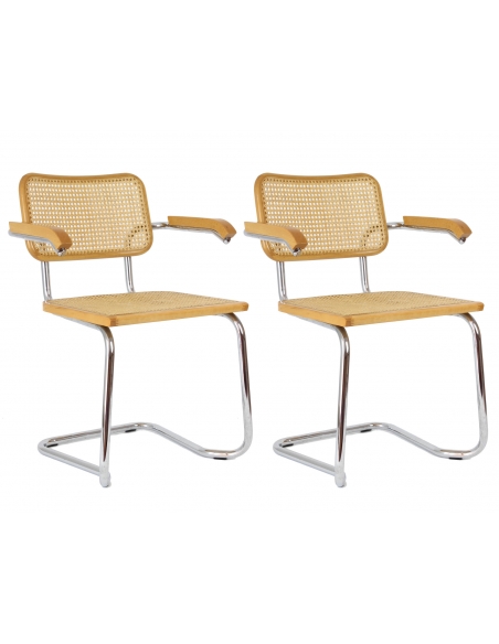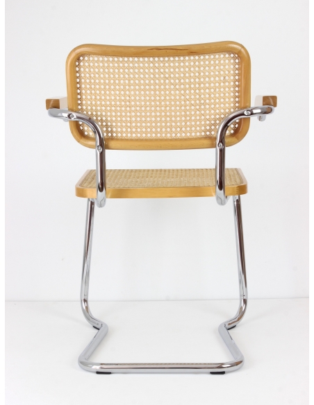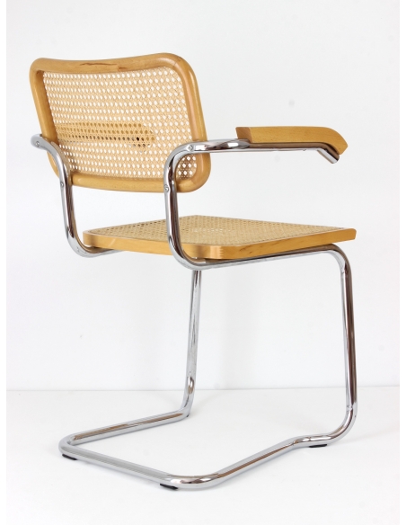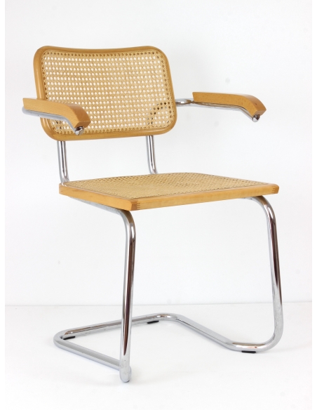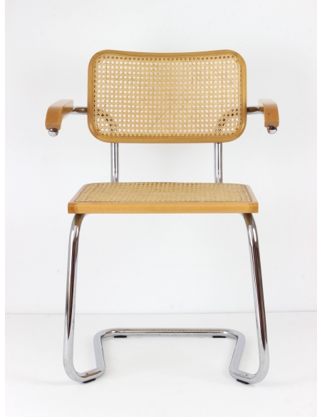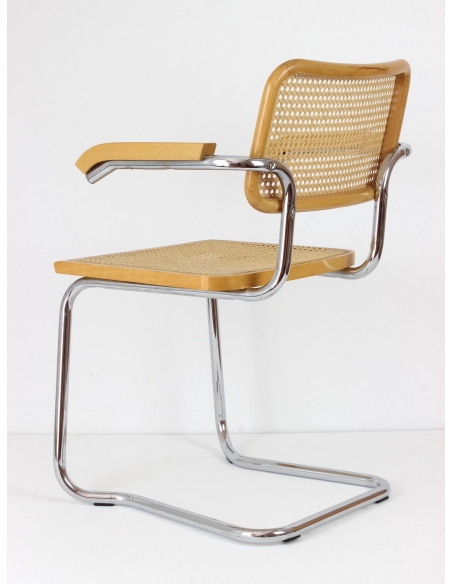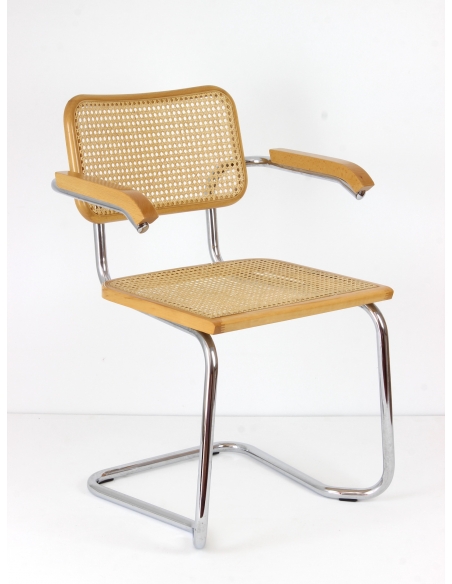 Krzesło wyprodukowane we Włoszech w latach 80., w oparciu o projekt Marcela Breuera i model Cesca S64, a zatem wersja z podłokietnikami. Rama wykonana z chromowanej rury stalowej, oparcie i siedzisko z drewna bukowego wypełnionego rafią.