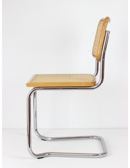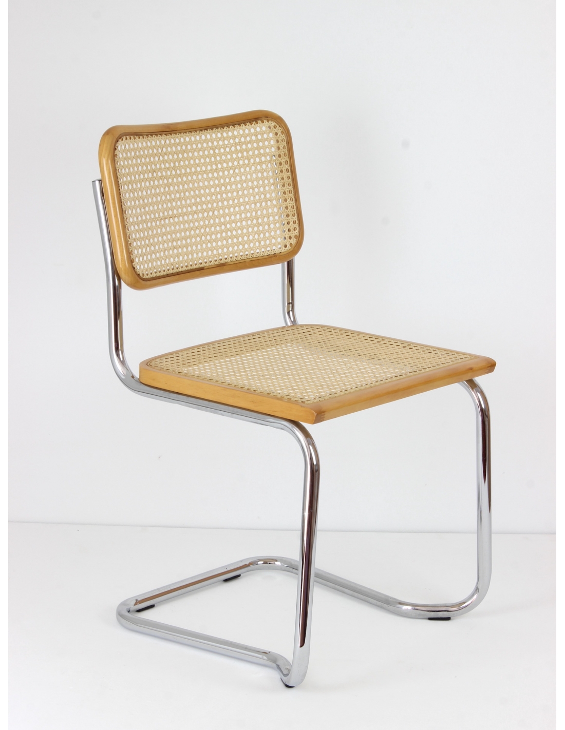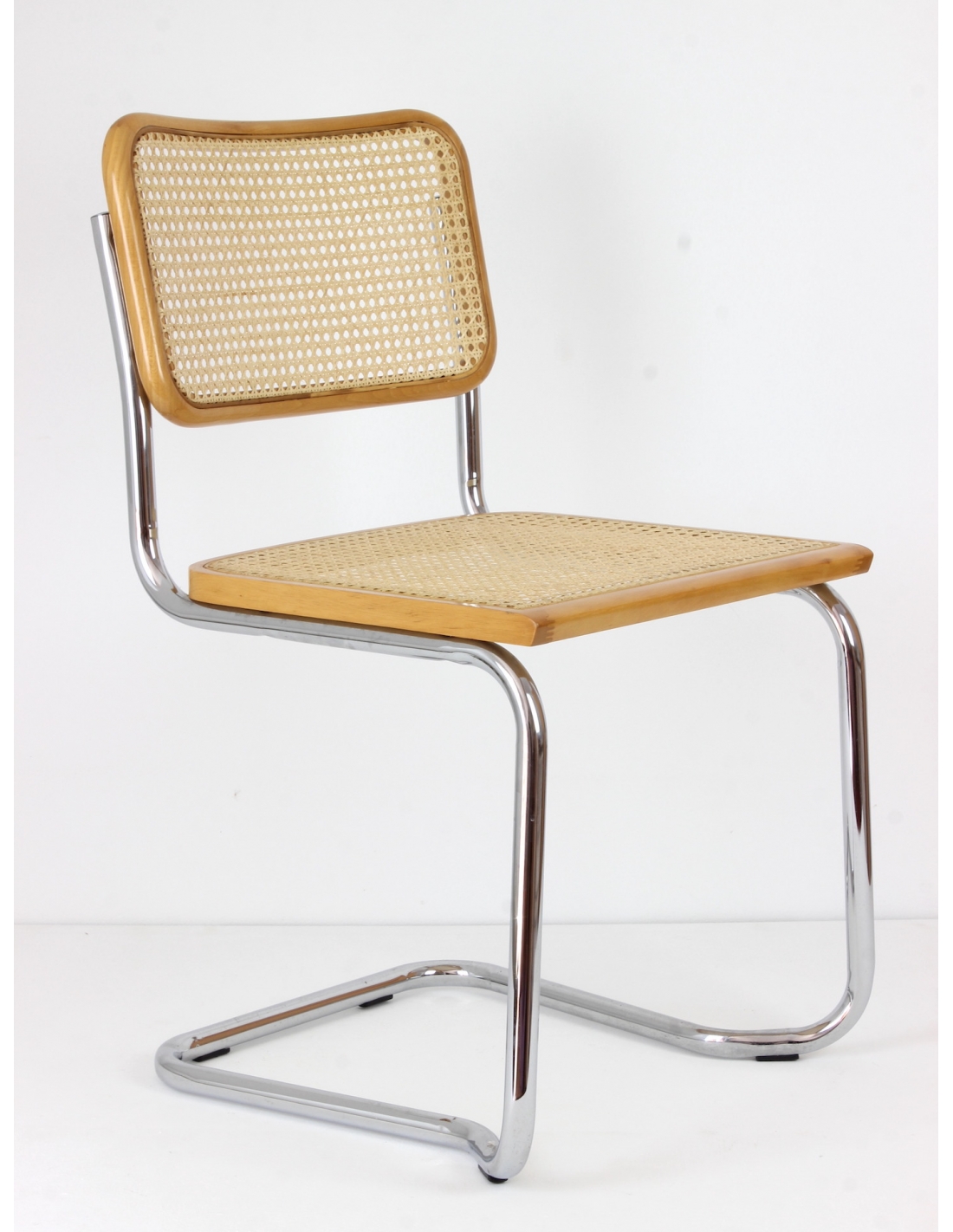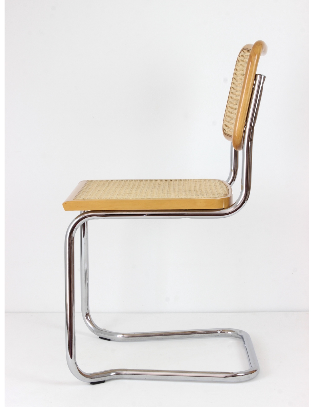 Krzesło wyprodukowane we Włoszech w latach 80., w oparciu o projekt Marcela Breuera i model Cesca S32, a zatem wersja bez podłokietników. Rama wykonana z chromowanej rury stalowej, oparcie i siedzisko z drewna bukowego wypełnionego rafią.