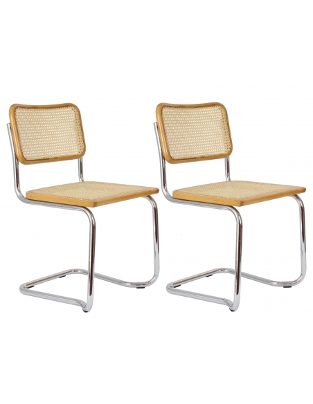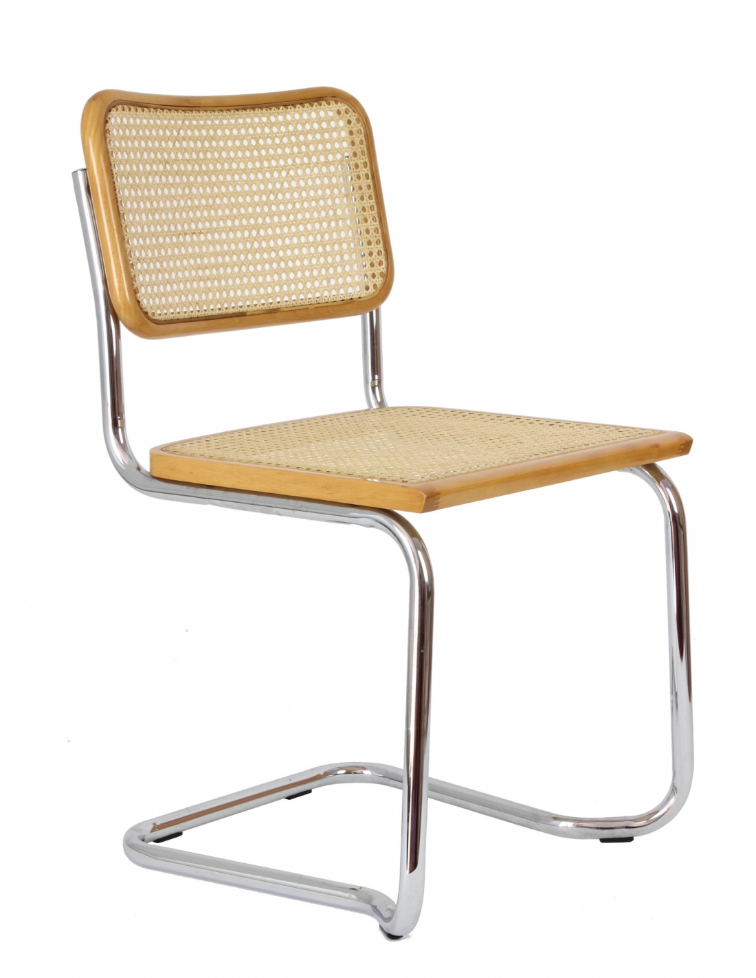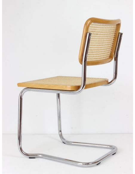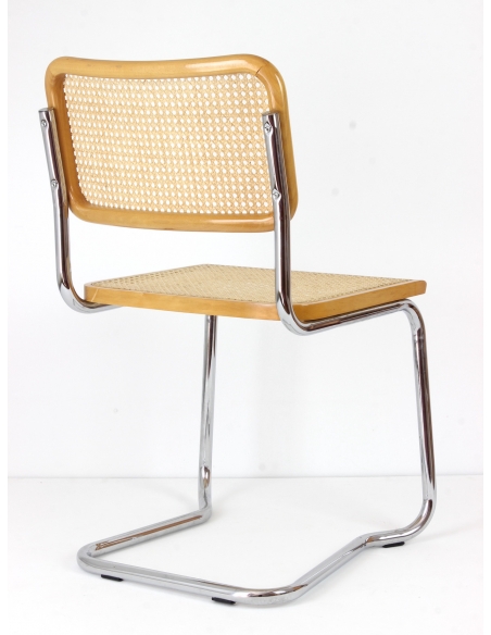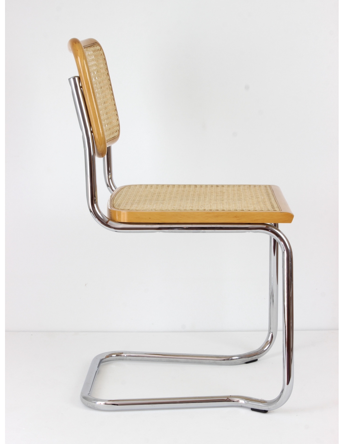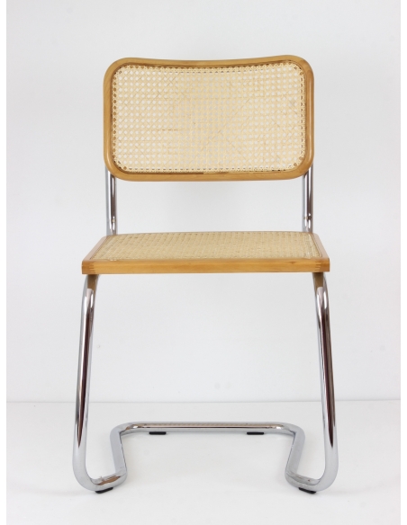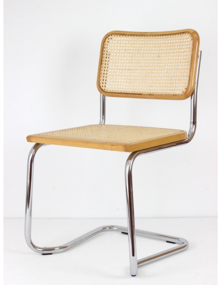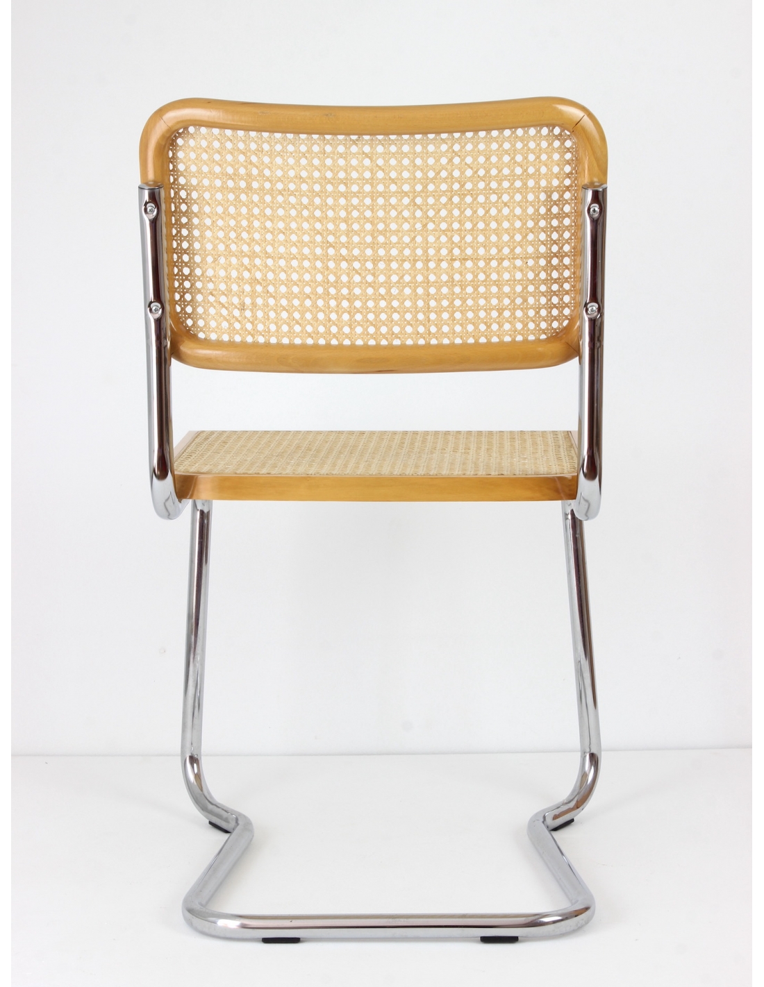 Krzesło wyprodukowane we Włoszech w latach 80., w oparciu o projekt Marcela Breuera i model Cesca S32, a zatem wersja bez podłokietników. Rama wykonana z chromowanej rury stalowej, oparcie i siedzisko z drewna bukowego wypełnionego rafią.