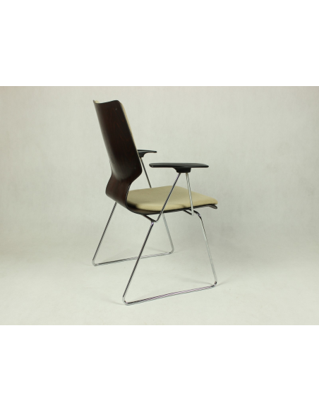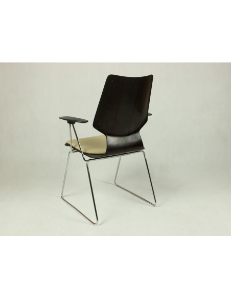 Krzesło pochodzące z lat 70, wyprodukowane w Niemczech. Konstrukcja - stal chromowana, siedzisko i oparcie - drewno wraz z jasną materiałową tapicerką, podłokietniki z tworzywa. Krzesło idealnie odnajdzie się w jadalni, salonie, poczekalni, biurze czy restauracji.