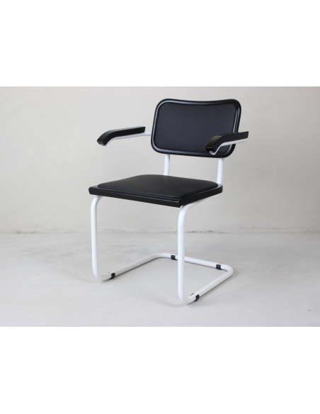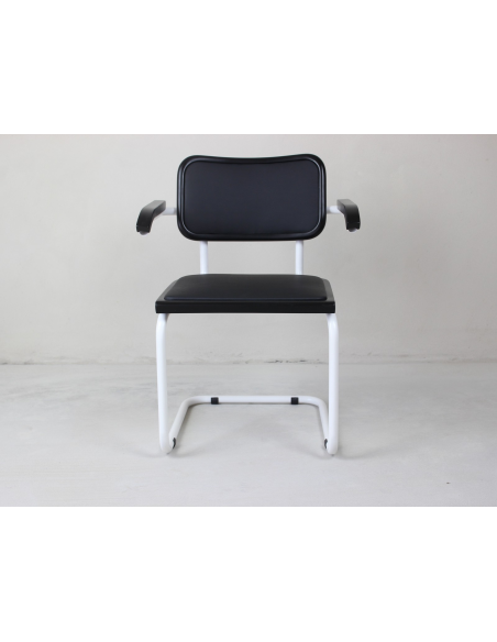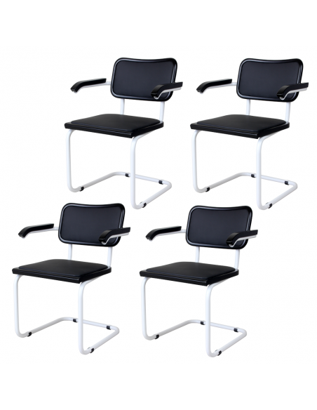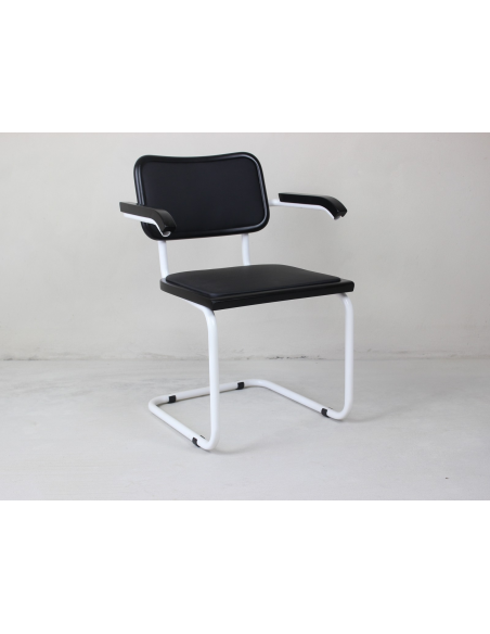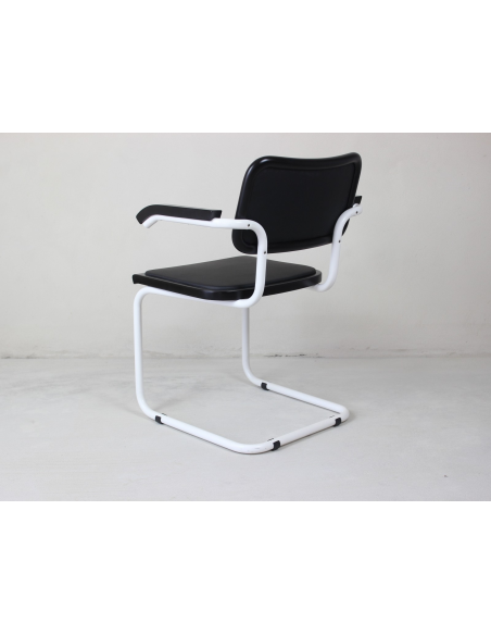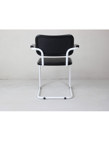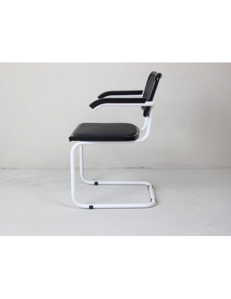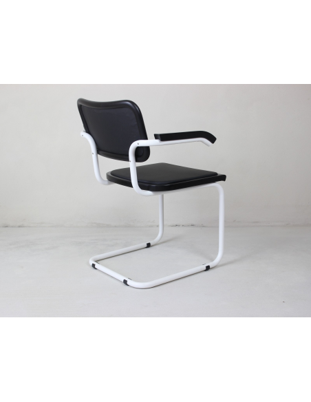 Krzesła według projektu Marcela Breuera, pochodzące z lat 70, wyprodukowane we Włoszech. Model Cesca S64. Konstrukcja - stal lakierowana na kolor biały, siedzisko i oparcie - lakierowane drewno bukowe z wykończeniem ze skóry ekologicznej. Krzesła idealnie odnajdą się w jadalni, salonie, poczekalni, biurze czy restauracji.