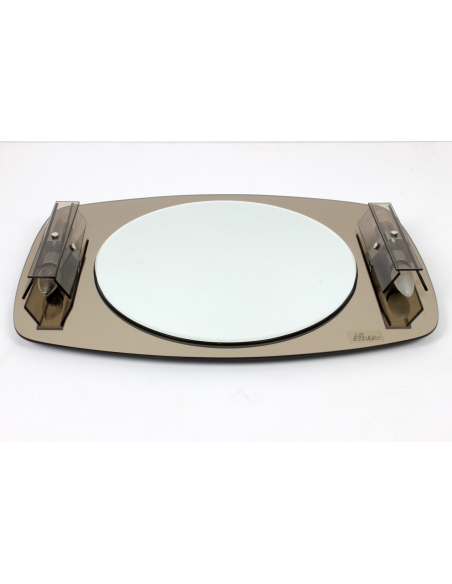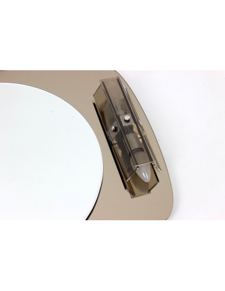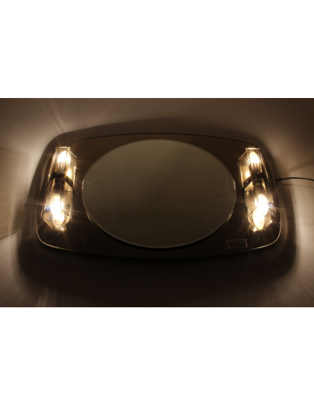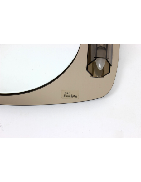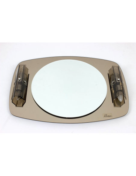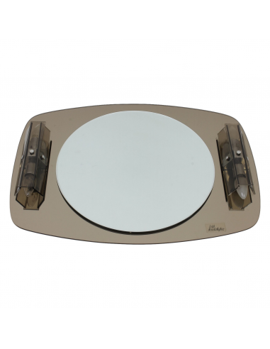 Lustro ścienne z kinkietami pochodzące z lat 70. Wykonane jest ze szkła kryształowego. Lustro posiada wmontowane kinkiety.
