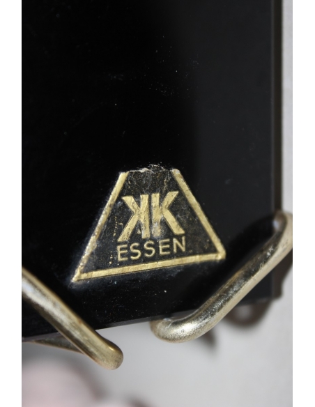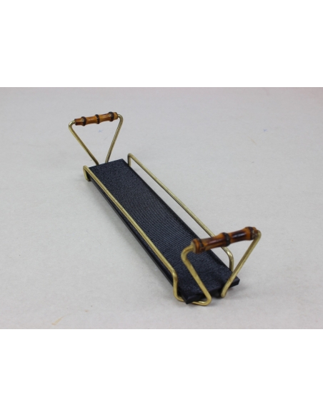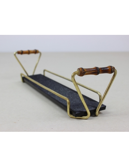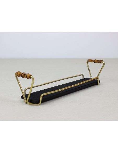 Patera na kieliszki, Essen wyprodukowana w latach 60. Wykonana jest z aluminium i czarnego szkła. Uchwyty drewniane.