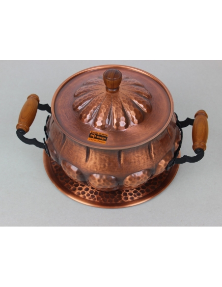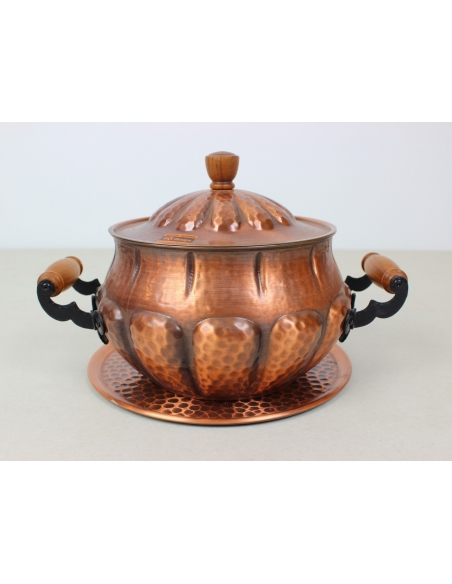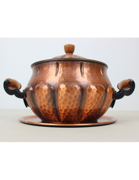 Waza z tacą wyprodukowana w latach 60. Wykonana z tłoczonej blachy miedzianej.