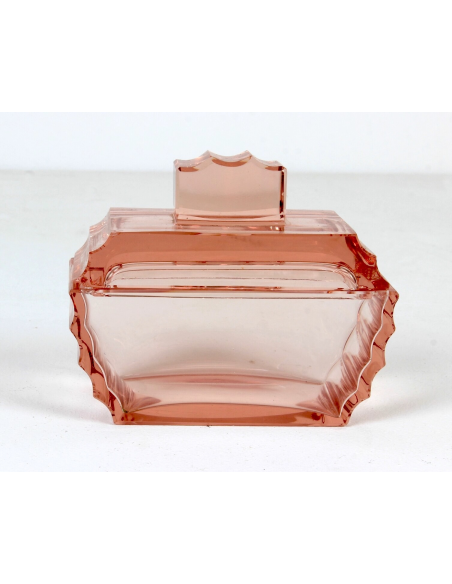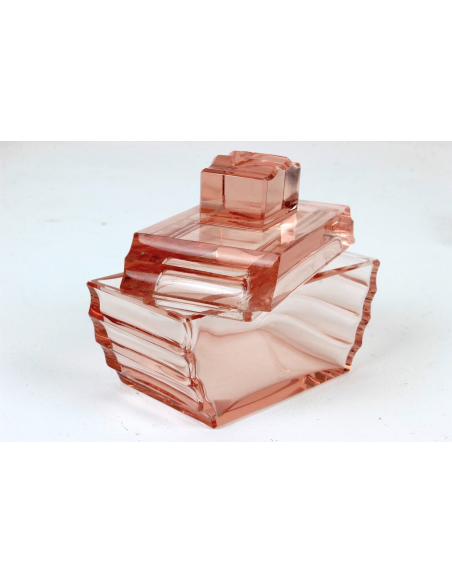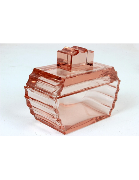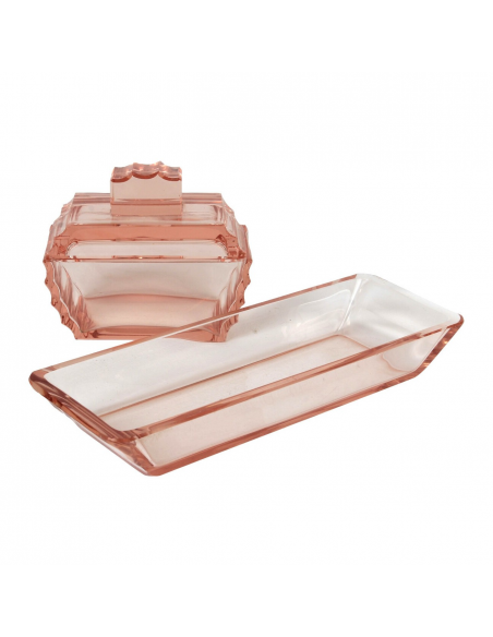 Komplet bombonierka z paterką Art Deco, Karlowe Wary, Bohemia, lata 1920-30, wytwórnia Ludwik Moser & Sohne. Zestaw wykonany z kryształowego szlifowanego szkła. Róg przykrycia bombonierki posiada wykruszenie, widoczne na zdjęciach.