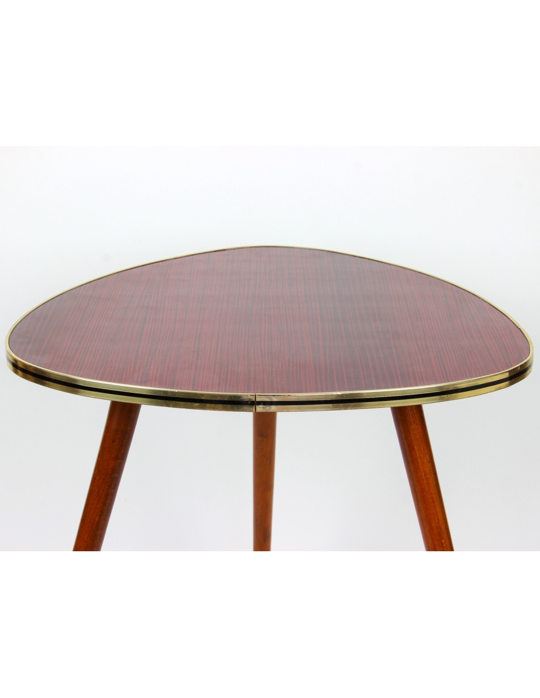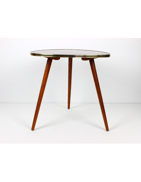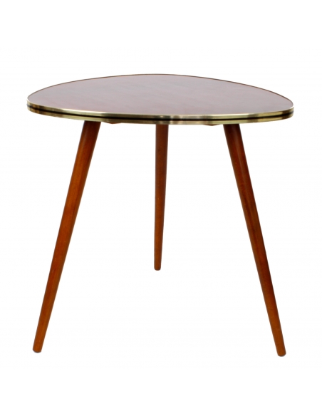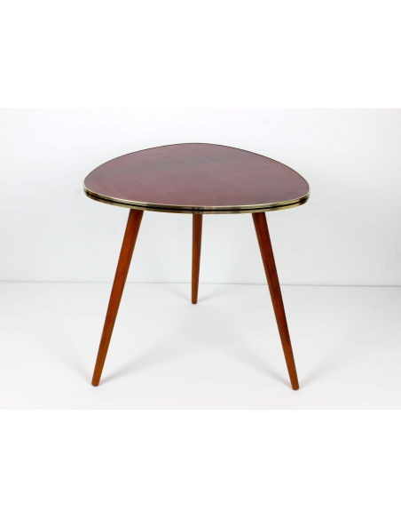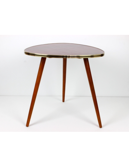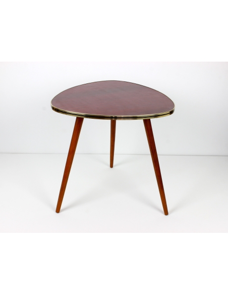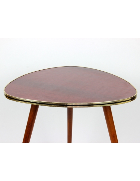 Drewniany stolik kawowy osadzony na trzech nogach. Wyprodukowany w latach 60-tych. Charakteryzuje się ciekawą formą oraz ponadczasowym dizajnem. Blat w bardzo ciekawym, wiśniowym kolorze. Nogi do transportu zostaną odkręcone.