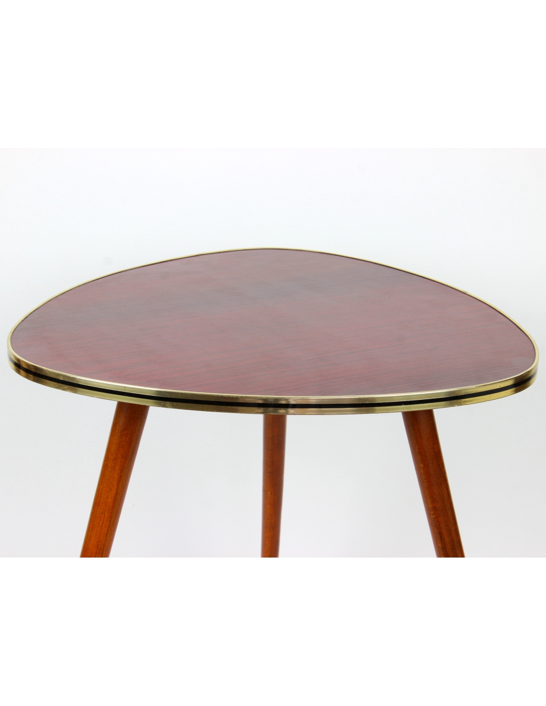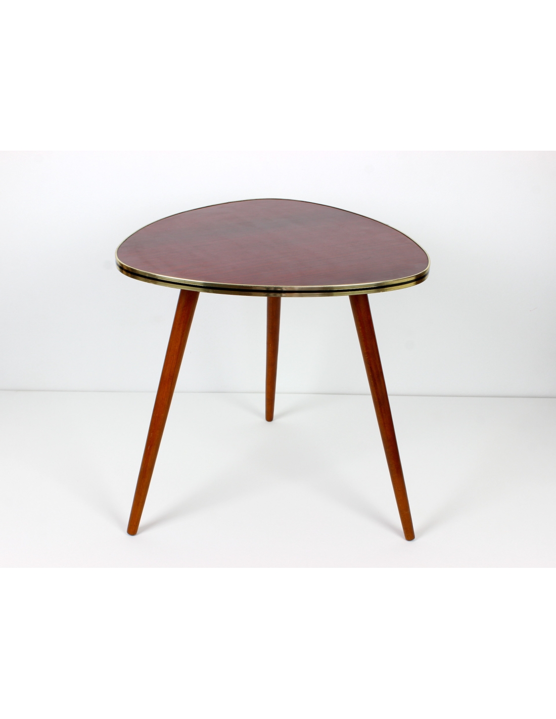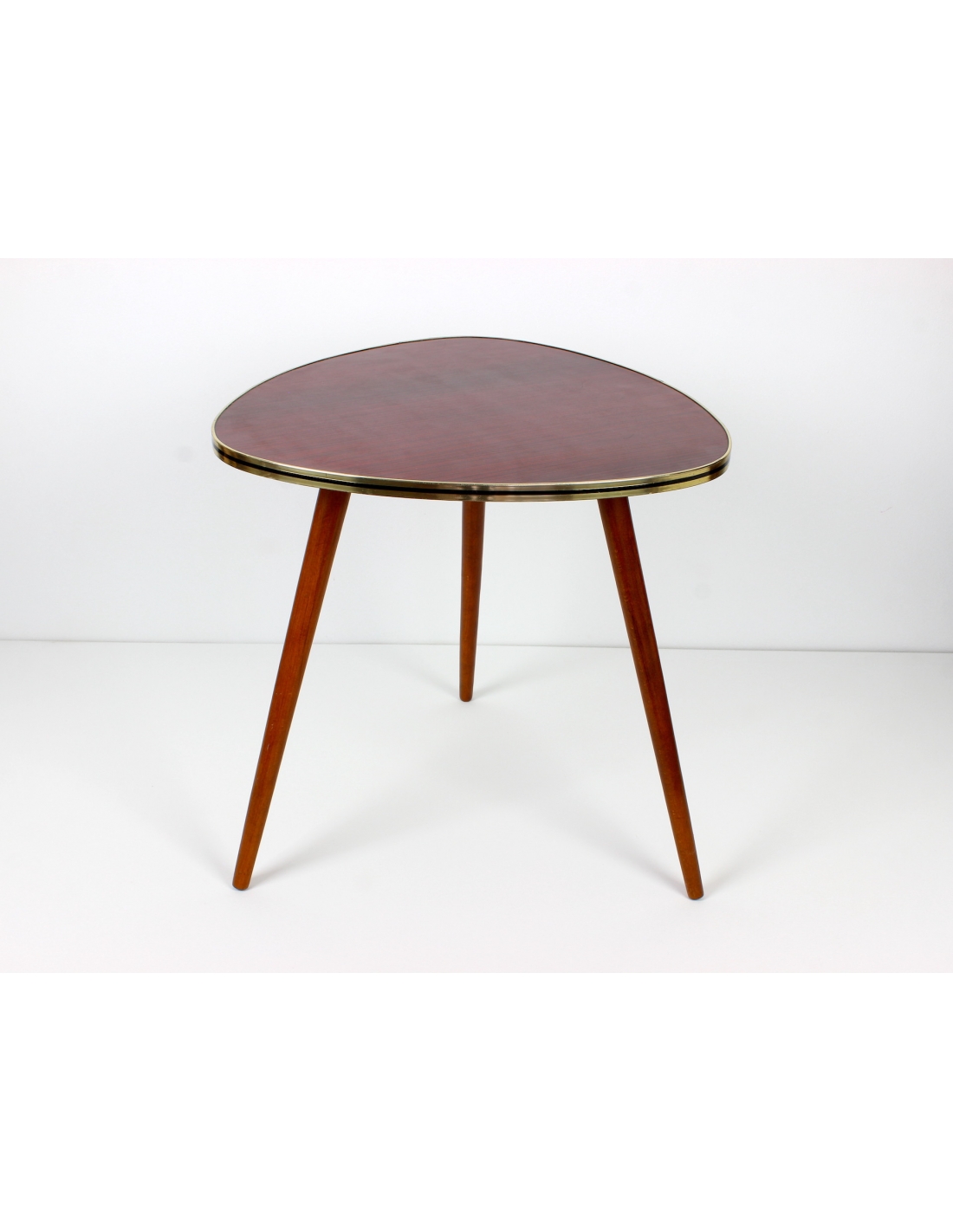 Drewniany stolik kawowy osadzony na trzech nogach. Wyprodukowany w latach 60-tych. Charakteryzuje się ciekawą formą oraz ponadczasowym dizajnem. Blat w bardzo ciekawym, wiśniowym kolorze. Nogi do transportu zostaną odkręcone.