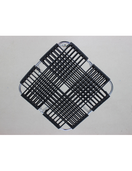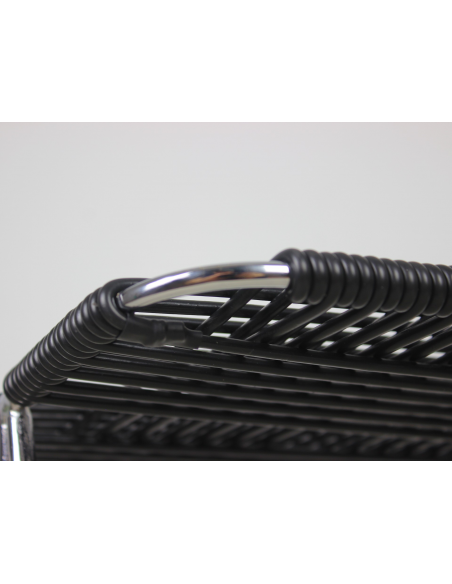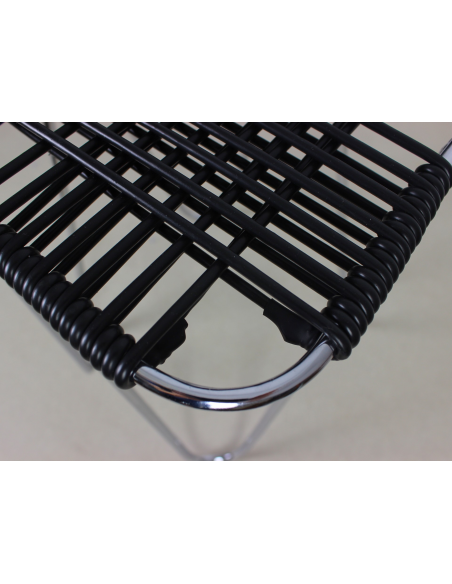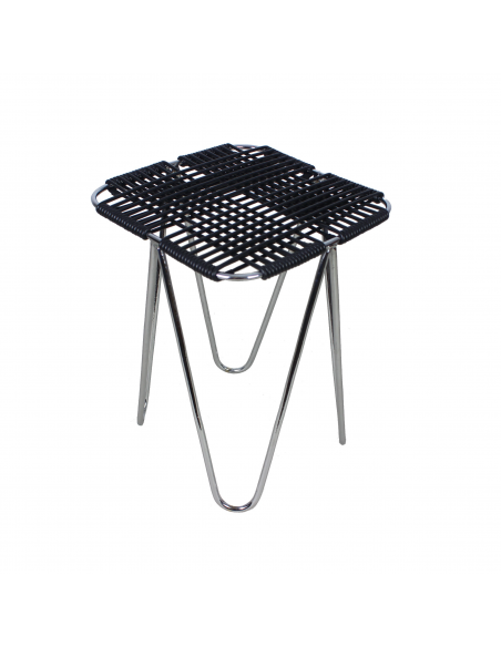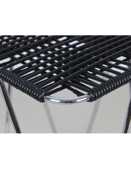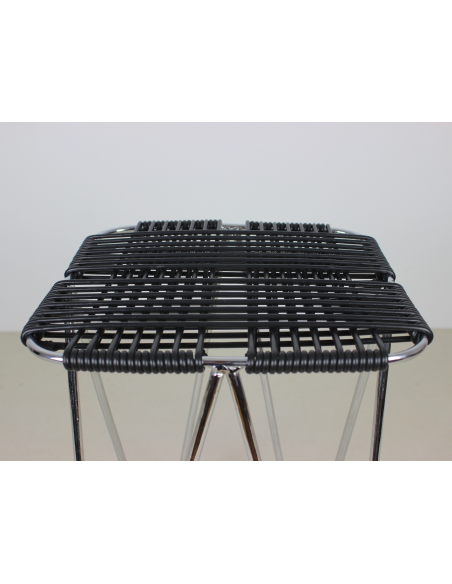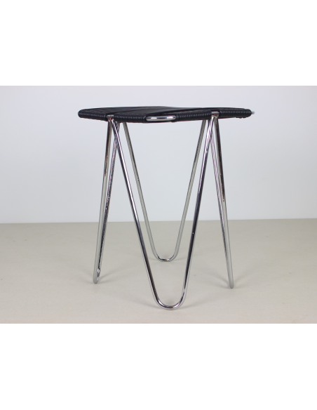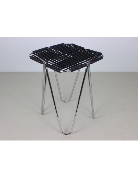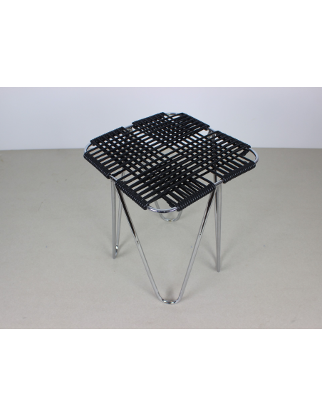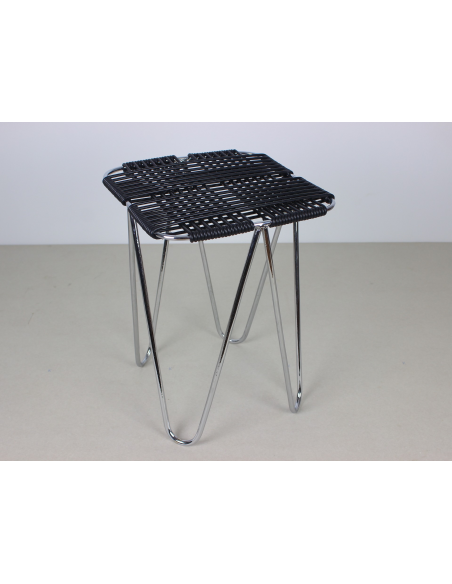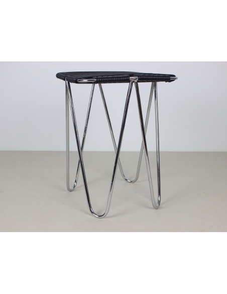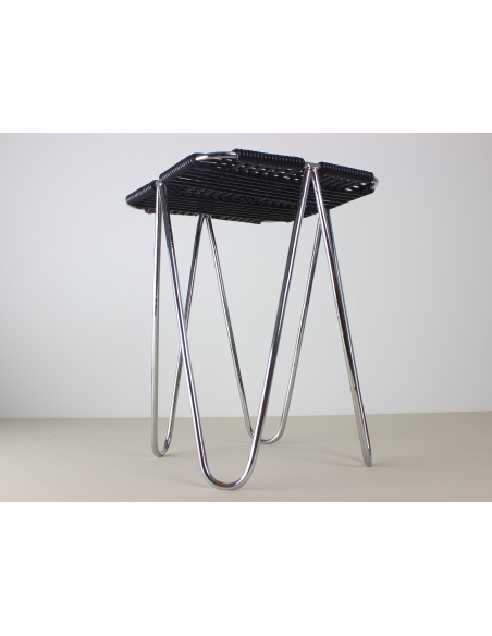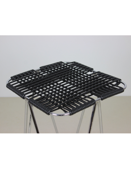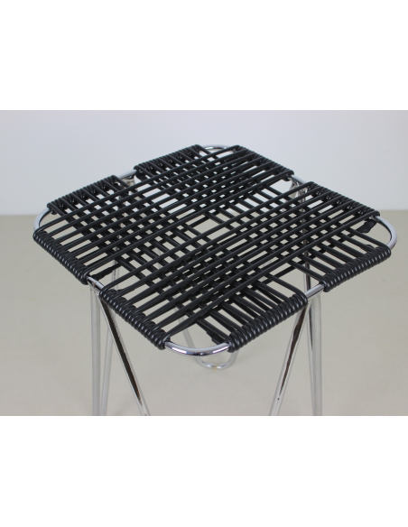 Taboret projektu Władysława Wołkowskiego. Stelaż ze stali chromowanej, siedzisko wykonane z czarnych żyłek z tworzywa sztucznego.