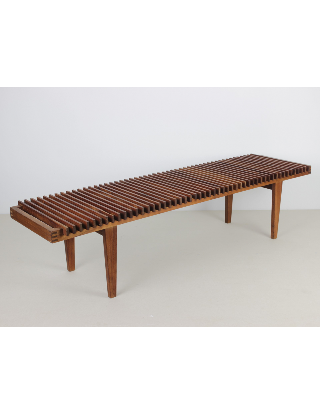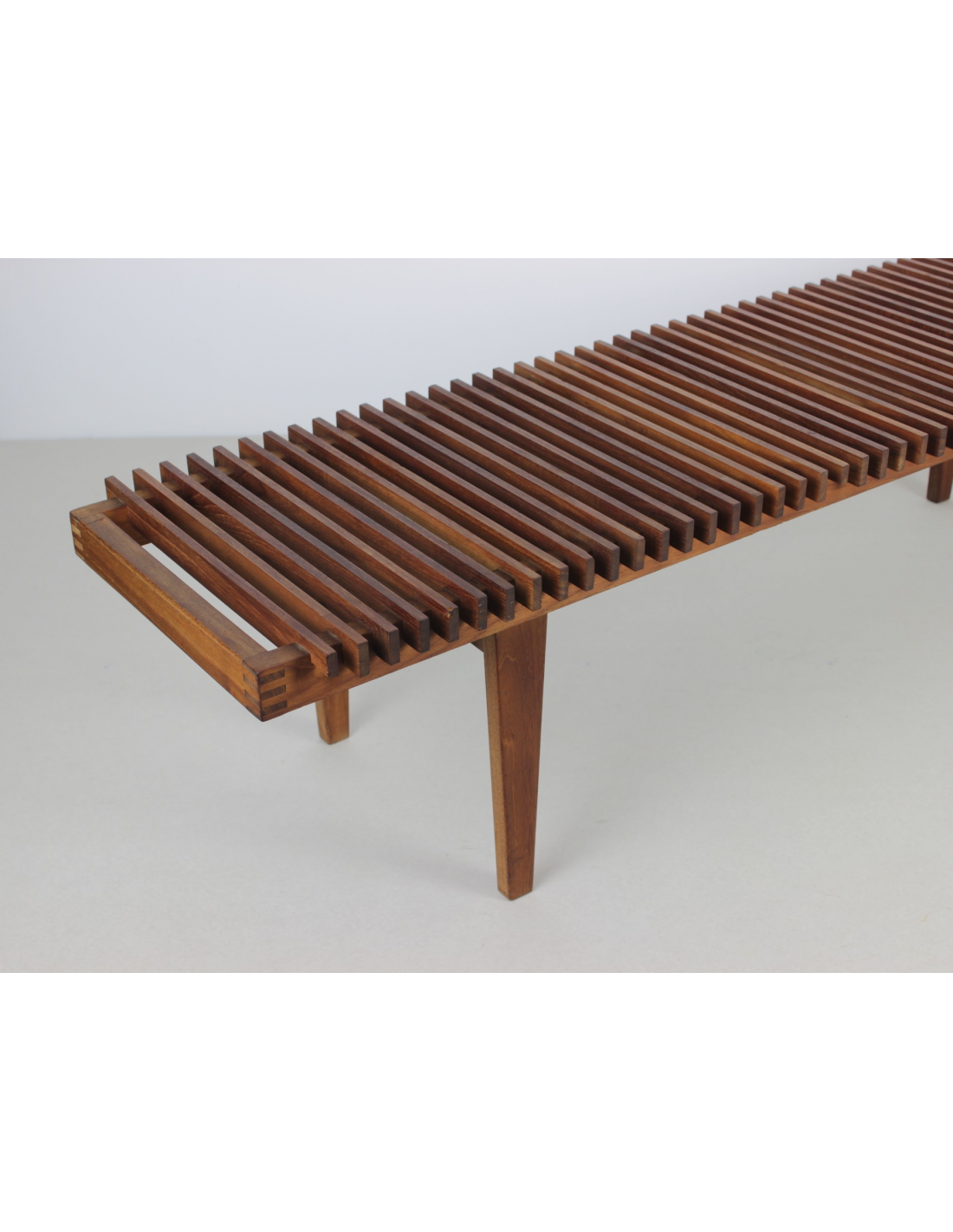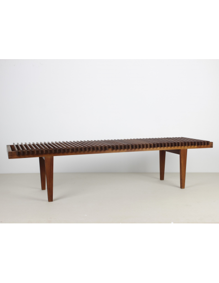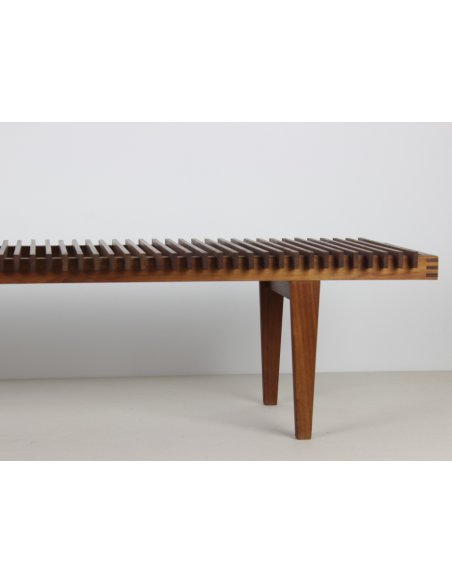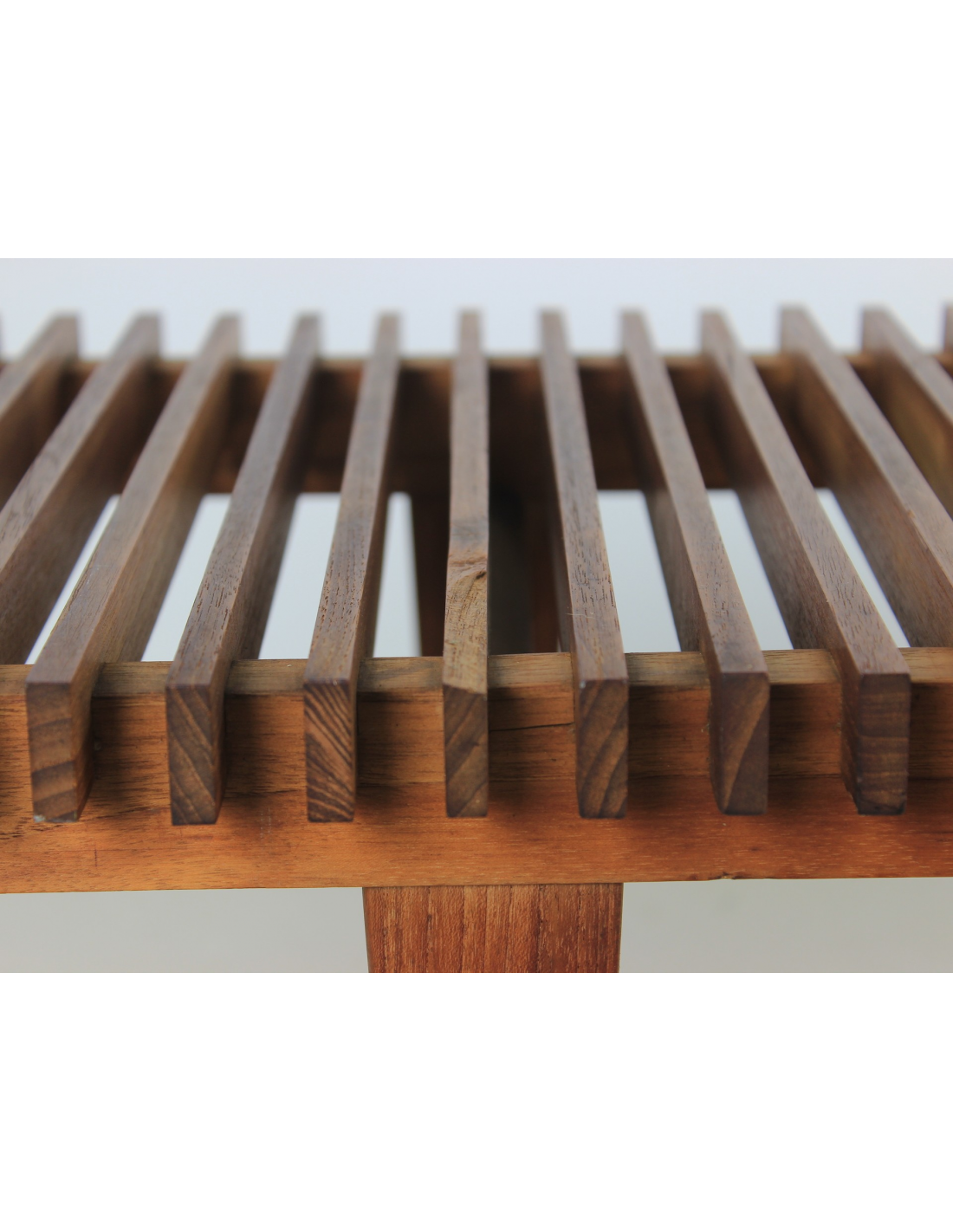 Ławka wyprodukowana w Danii w latach 60-tych wykonana jest z litego drewna tekowego.