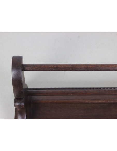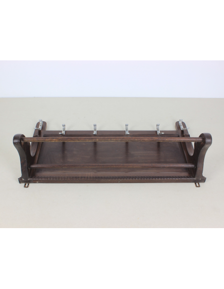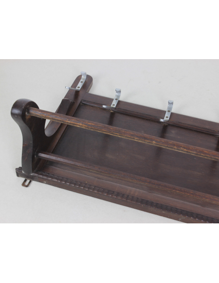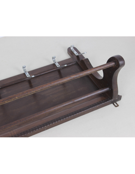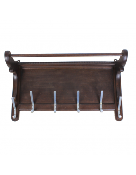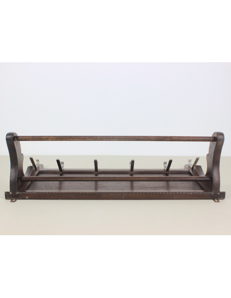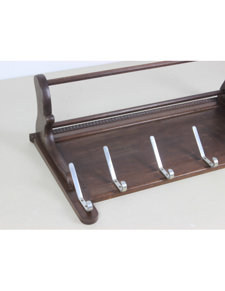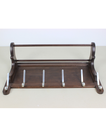 Drewniany wieszak ścienny pochodzący z lat 50-tych. Posiada sześć aluminiowych haczyków oraz dwie drewniane poprzeczki stanowiące swego rodzaju półkę umożliwiającą położenie kapelusza czy czapki. Jedna z poprzeczek posiada niedoskonałości. Haczyki z niewielkim nalotem patyny.