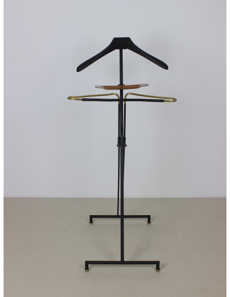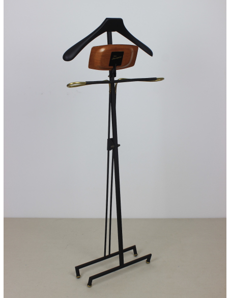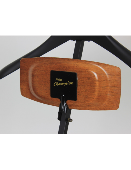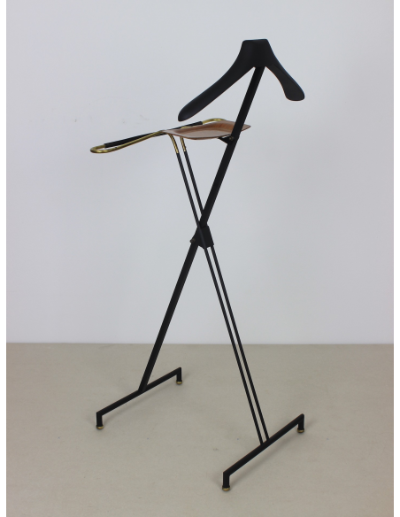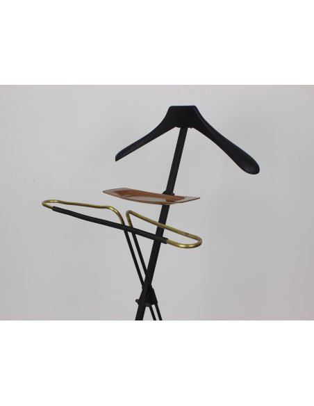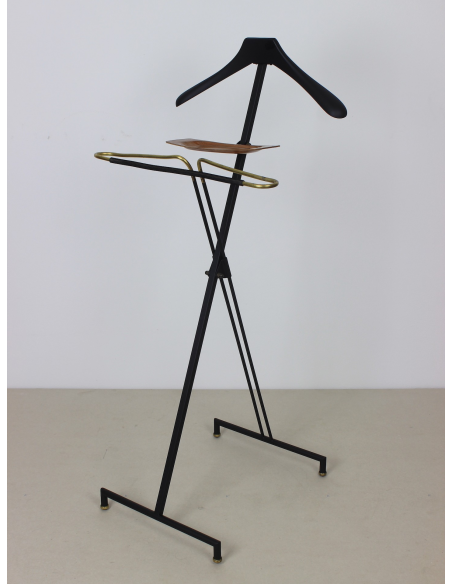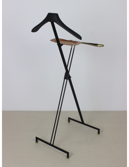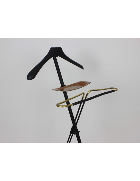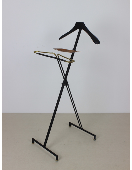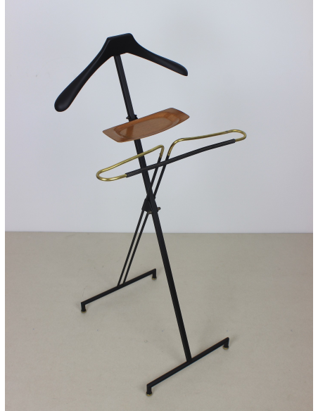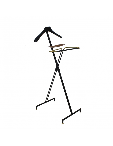 Składany wieszak, lokaj wyprodukowany w latach 60 dla Union Champion. Stelaż ze stali lakierowanej na kolor czarny. Uchwyt na spodnie - aluminiowy w kolorze złotym. Półka na biżuterię wykonana ze sklejki. Górna część drewniana. Złoty element wieszaka posiada niedoskonałości.