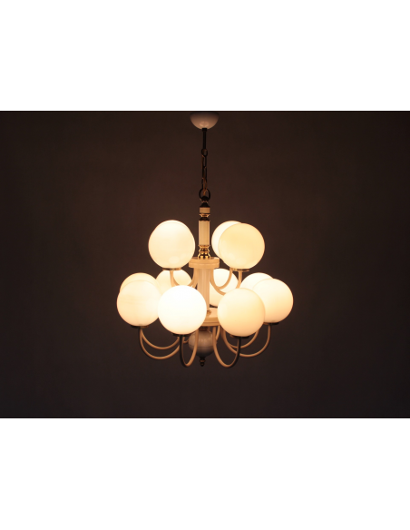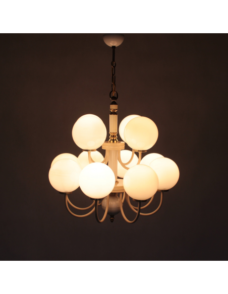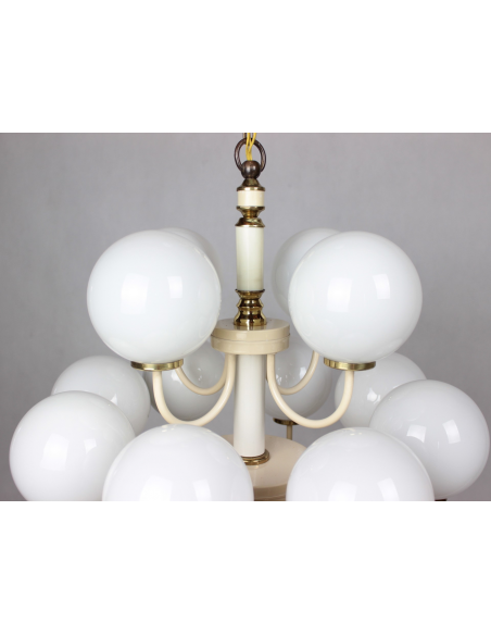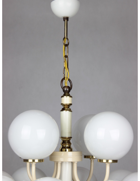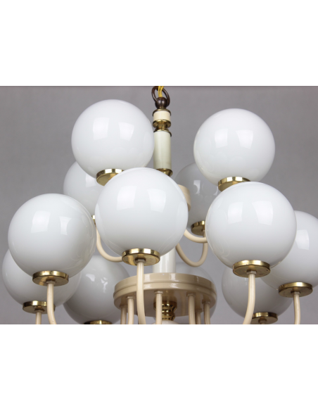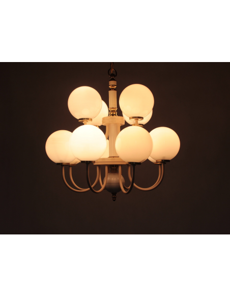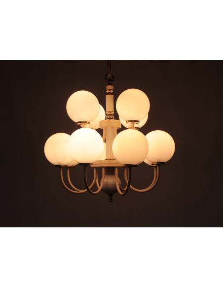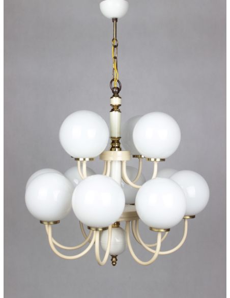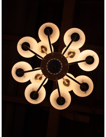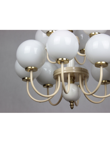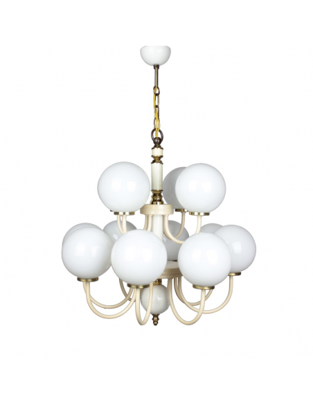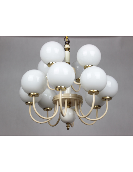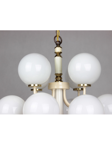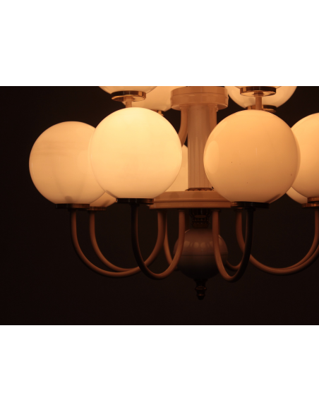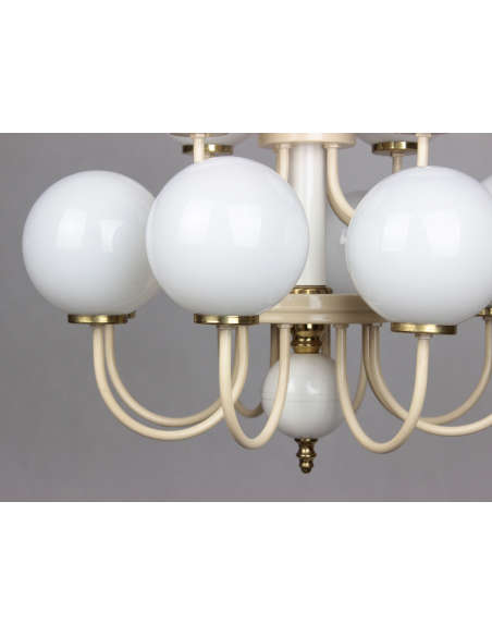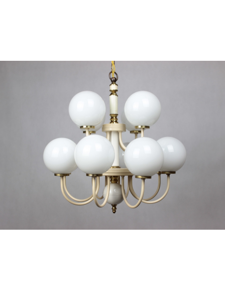 Żyrandol pochodzący z lat 60. Wyprodukowany przez zakłady MEOS w Warszawie. Wykonany z metalu, klosze z mlecznego szkła. Istnieje możliwość zapalenia niezależnie górnego lub dolnego poziomu.