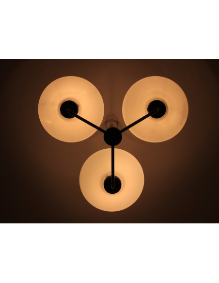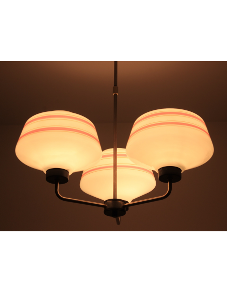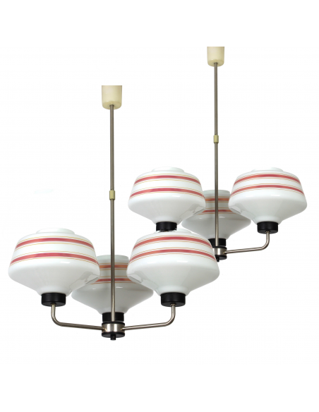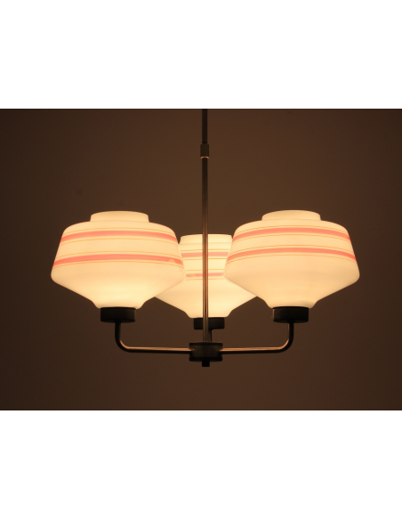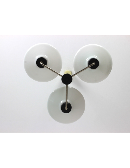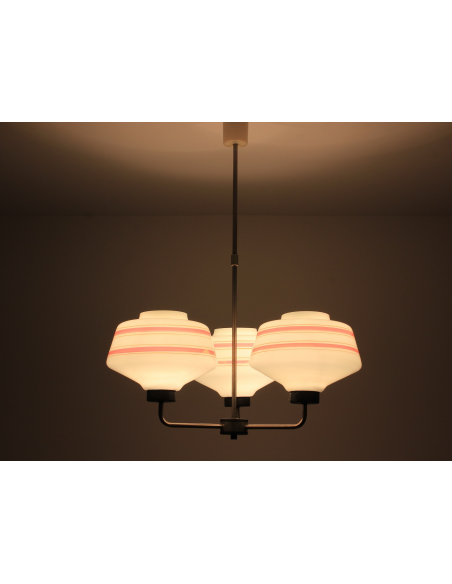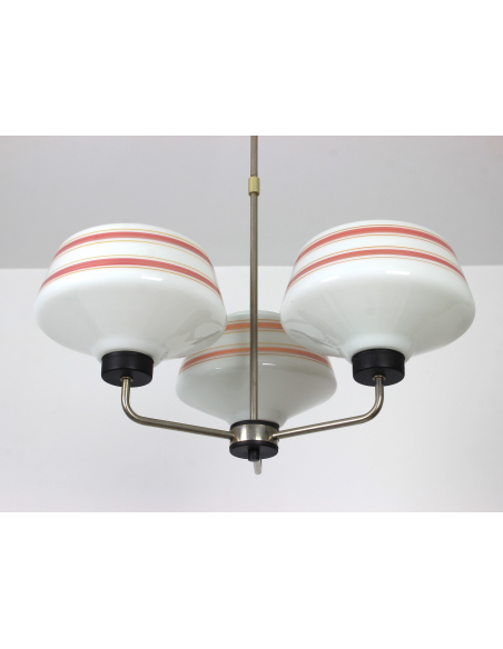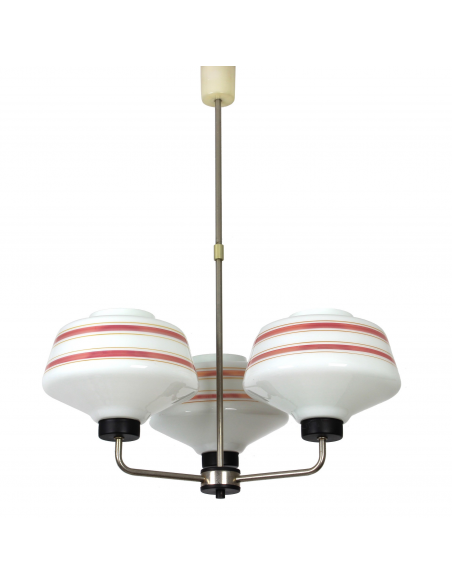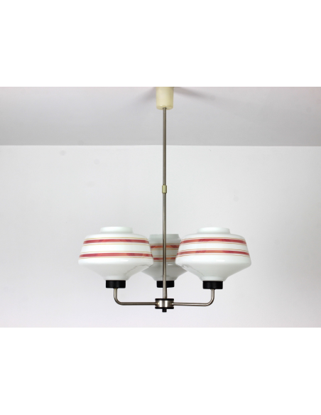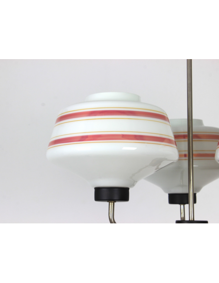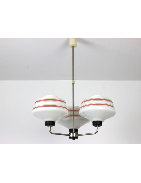 Żyrandol pochodzący z lat 60-tych. Klosze z mlecznego szkła. Elementy chromowane posiadają naturalny nalot i niewielkie niedoskonałości, które zdecydowanie dodają mu uroku.