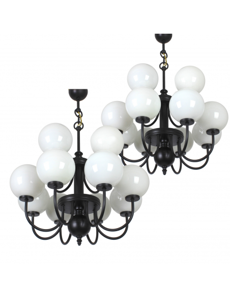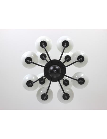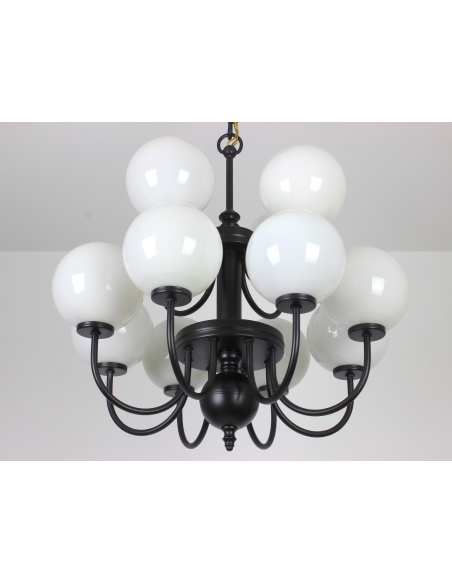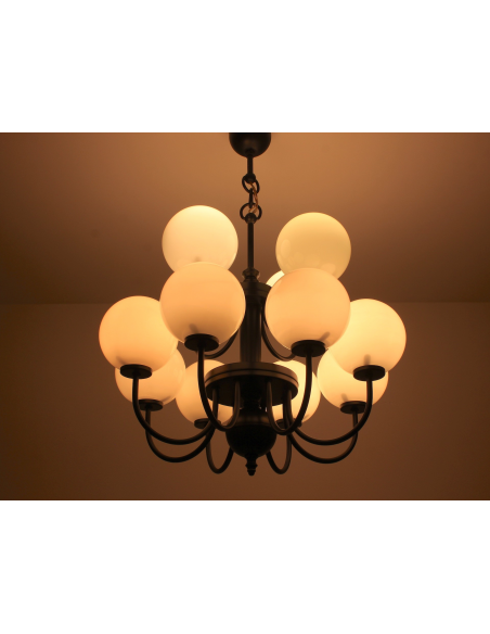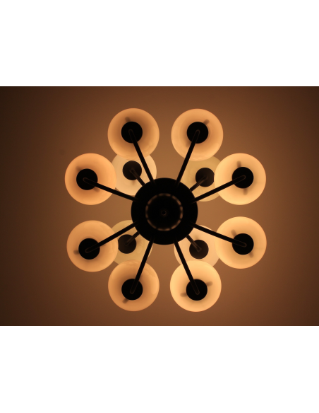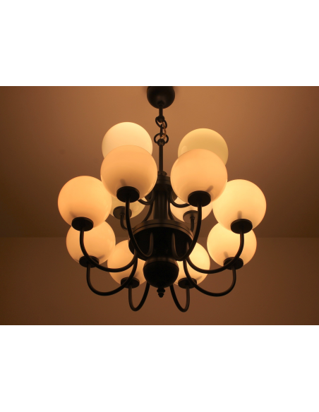 Żyrandol pochodzący z lat 60. Wyprodukowany przez zakłady Polam MEOS w Warszawie. Wykonany z metalu, klosze z mlecznego szkła. Istnieje możliwość zapalenia niezależnie górnego lub dolnego poziomu.