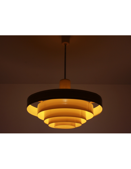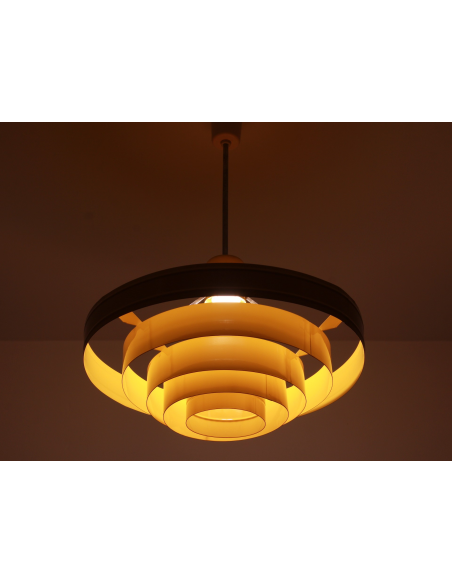 Lampa wyprodukowana w Polsce w latach 60. przez Zakłady Aparatury Oświetleniowej. Bazę stanowi pięć stalowych obręczy lakierowanych proszkowo. Powłoka lakiernicza nowa.