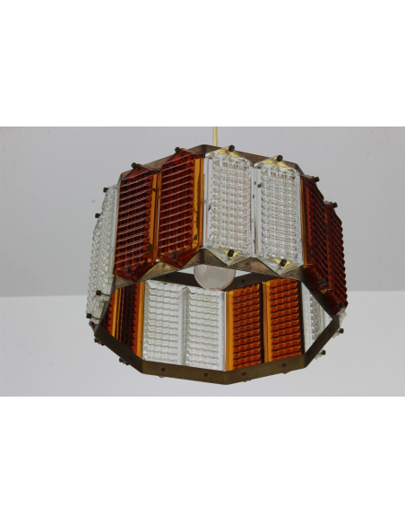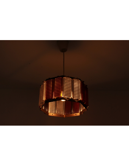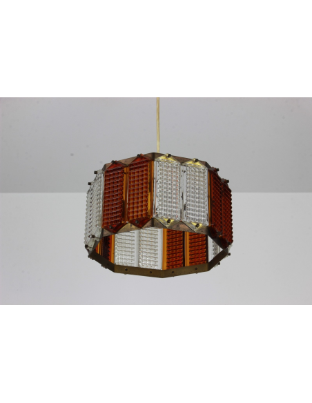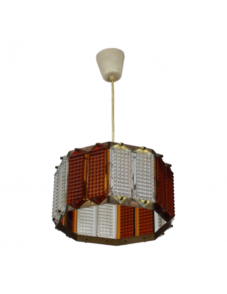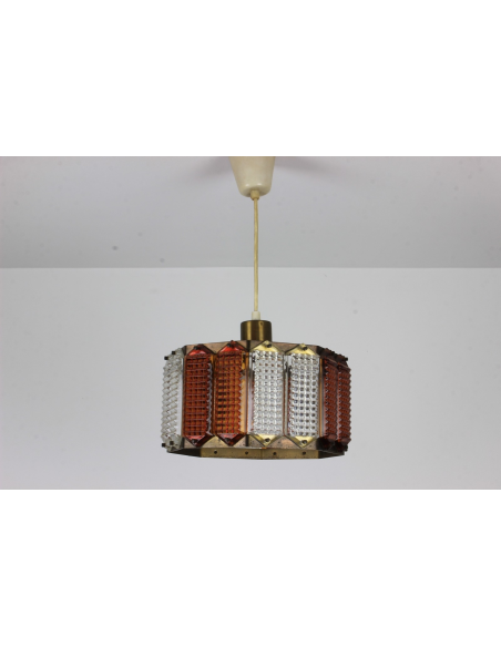 Lampa wyprodukowana w Polsce w latach 60. Wykonana jest z mosiądzu i szkła w przezroczystym i herbacianym kolorze. Mosiądz posiada naturalną patynę.