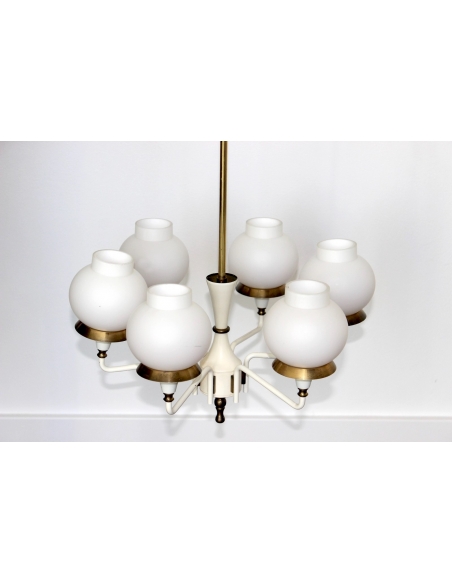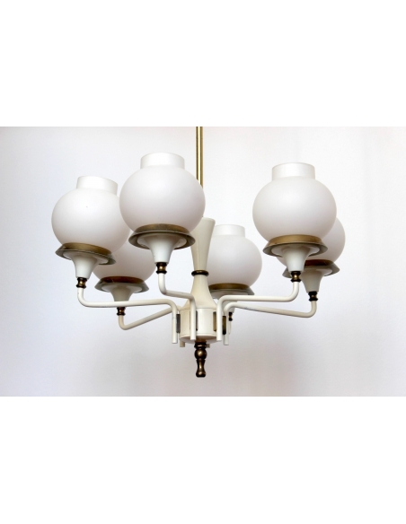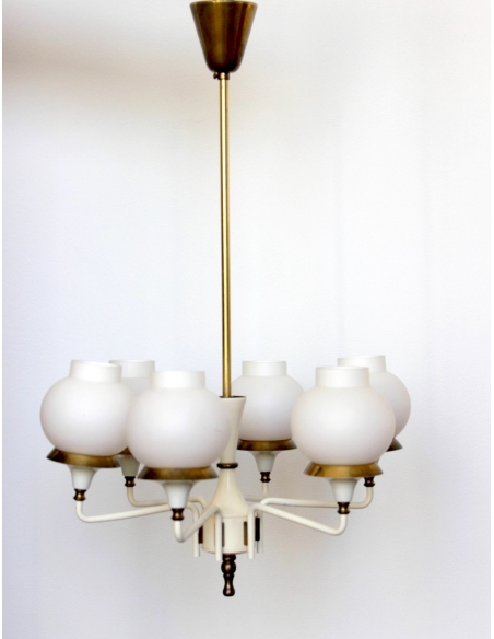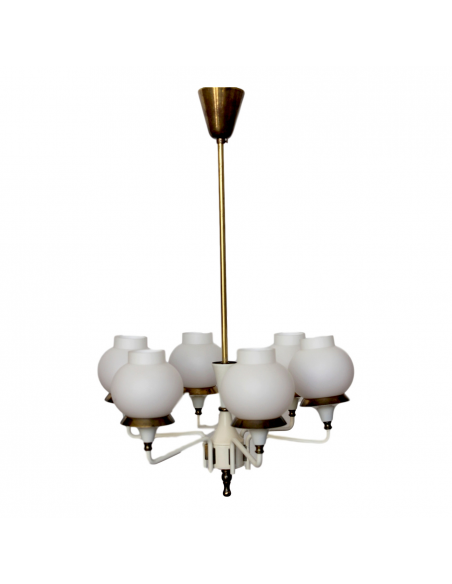 Żyrandol zaprojektowany przez Hansa-Agne Jakobssona w latach 50. Został wykonany z mosiądzu emaliowanego. Klosze wykonane są z mlecznego warstwowego szkła.