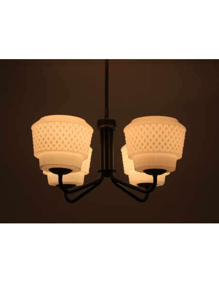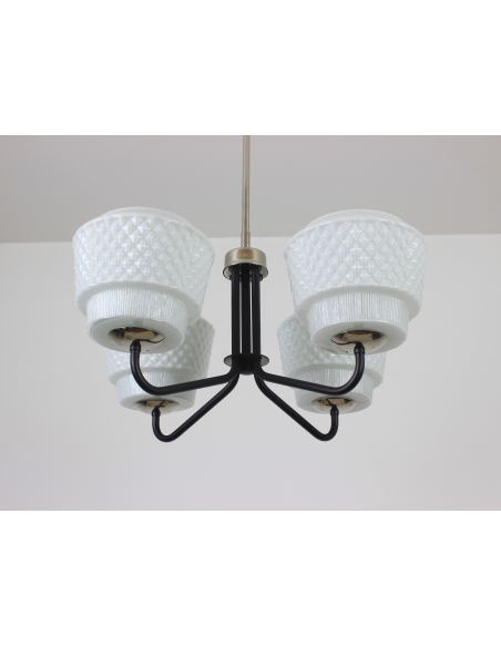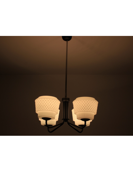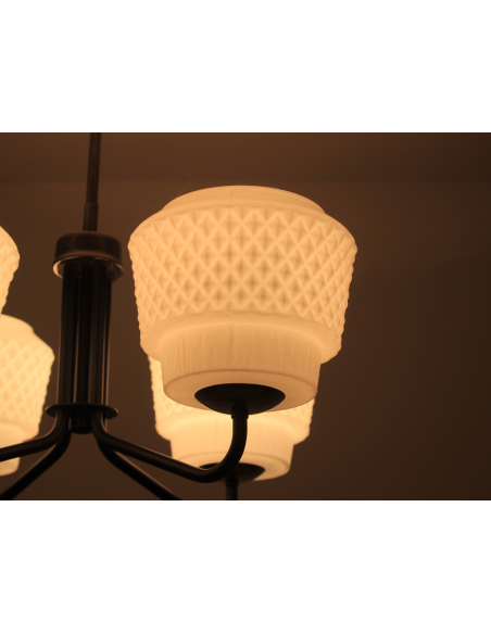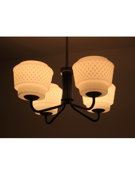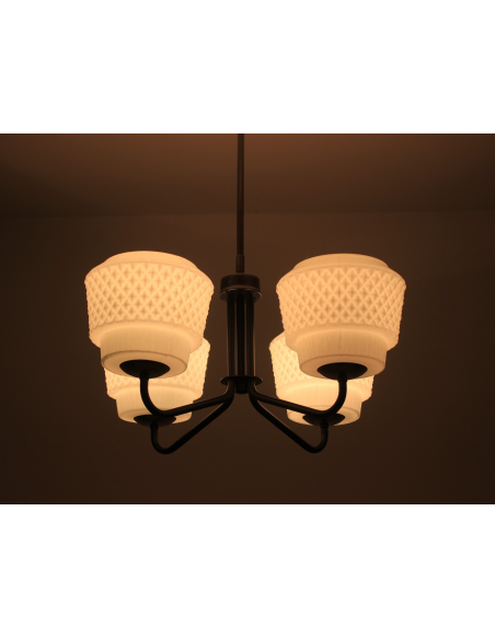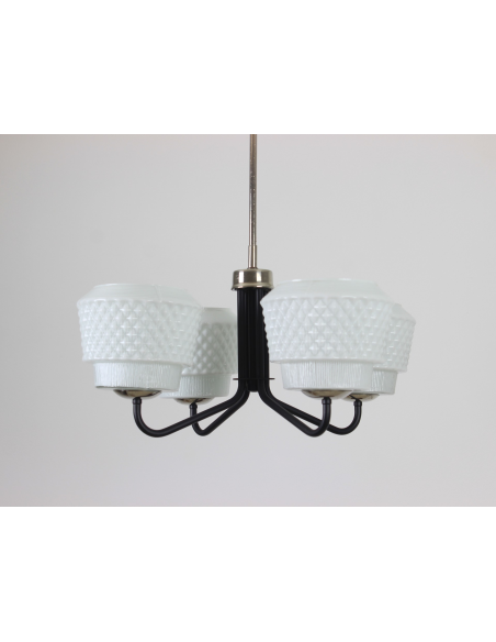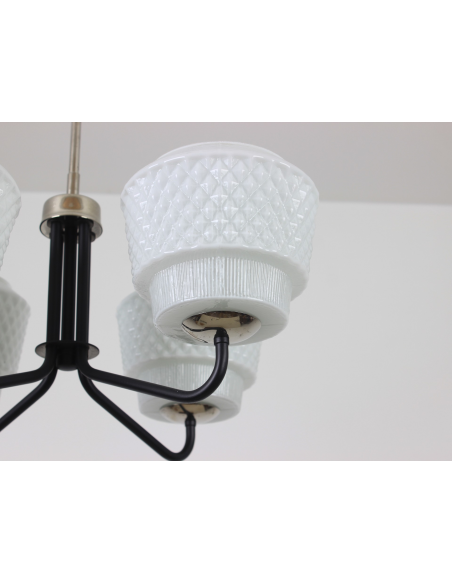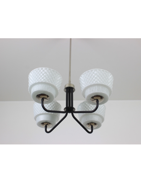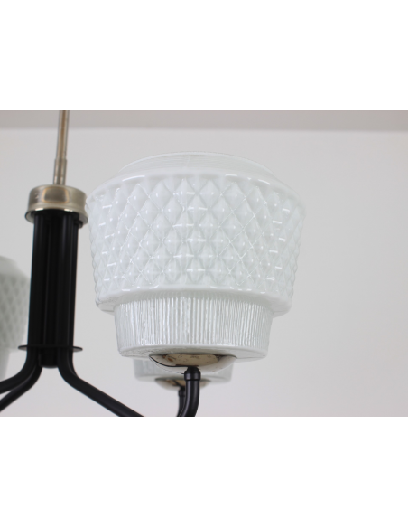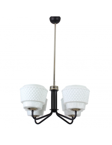 Żyrandol pochodzący z lat 60-tych, wyprodukowany przez zakłady Elmed w Zabrzu. Klosze z mlecznego szkła.