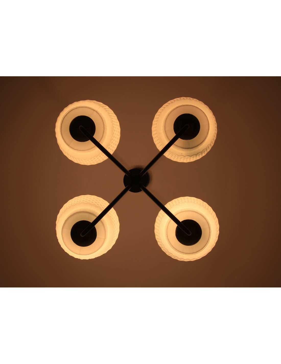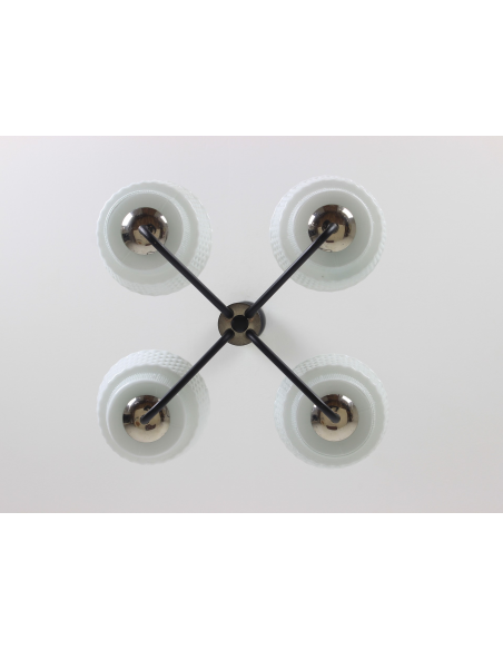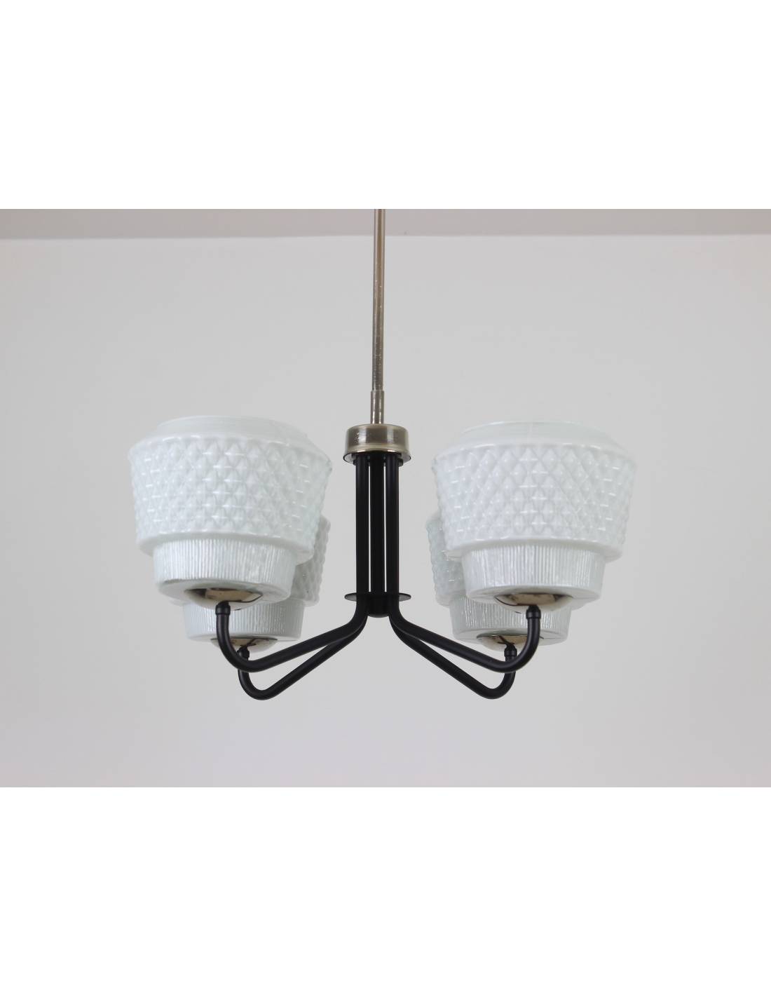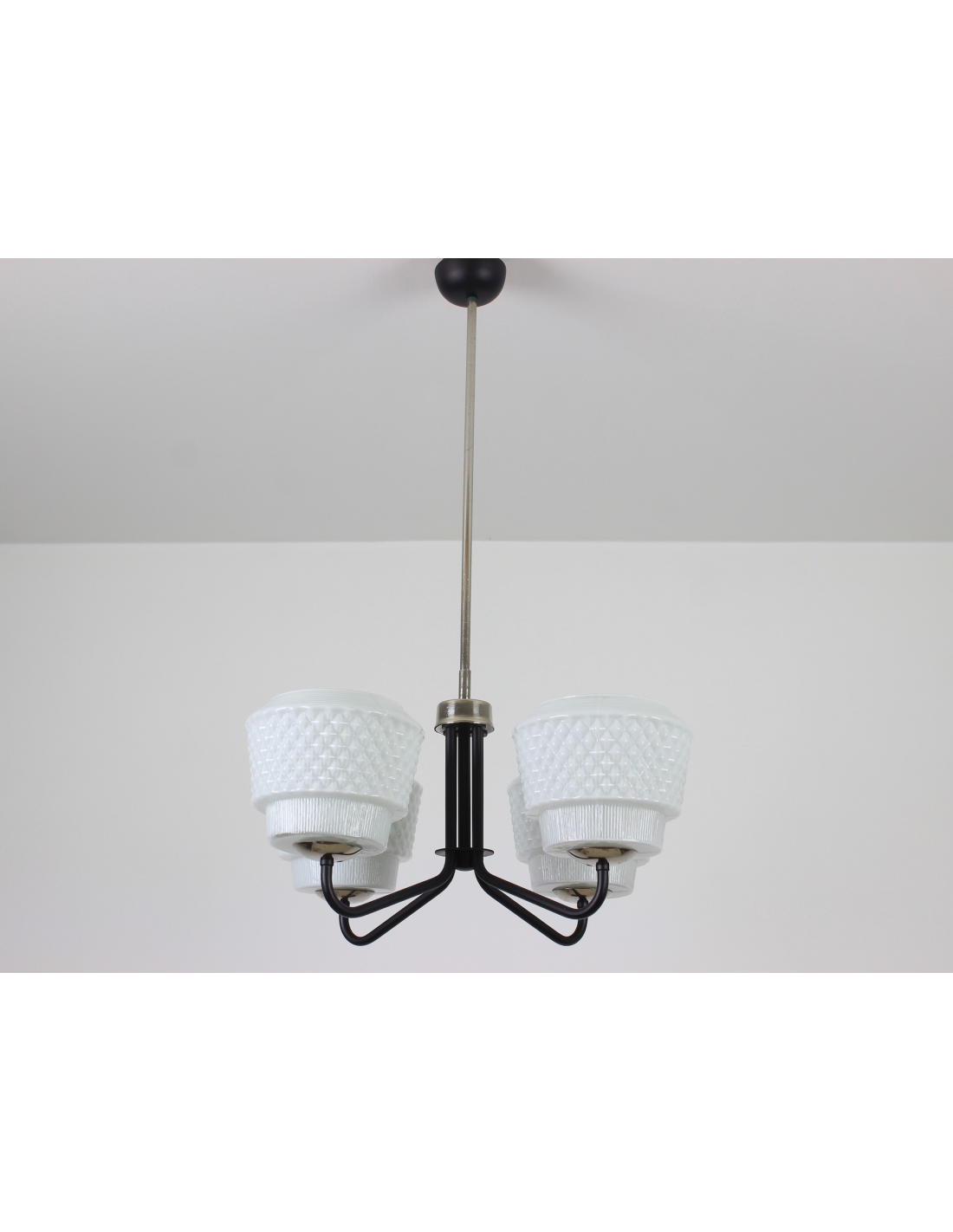 Żyrandol pochodzący z lat 60-tych, wyprodukowany przez zakłady Elmed w Zabrzu. Klosze z mlecznego szkła.