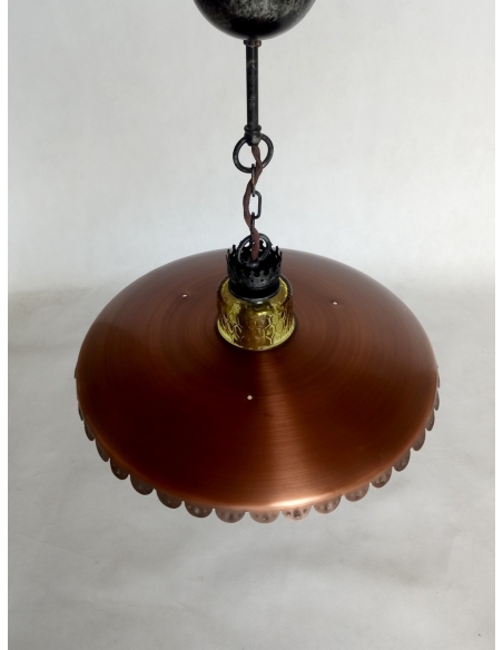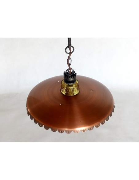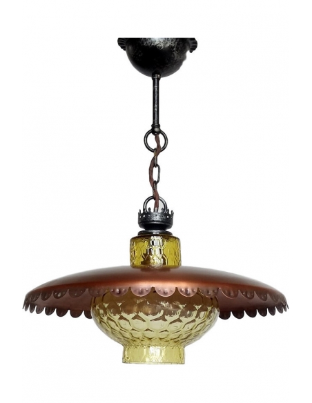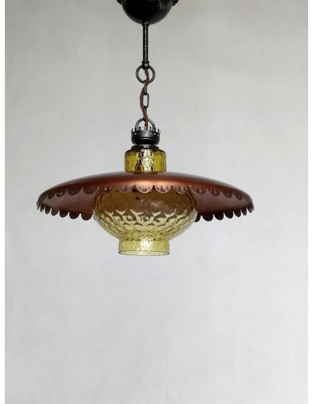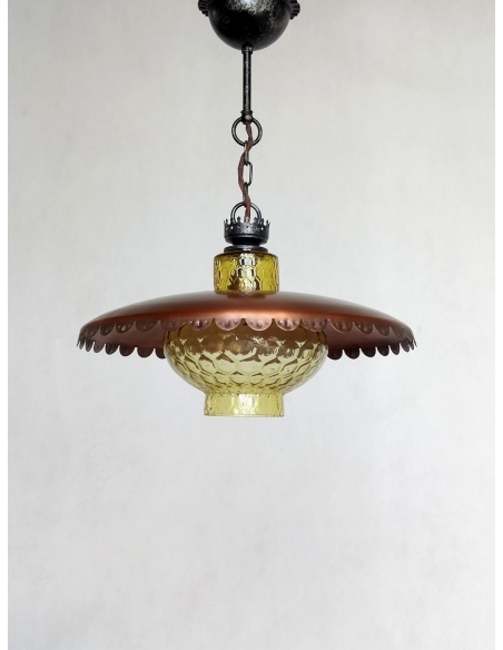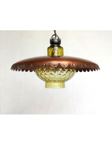 Lampa wyprodukowana w latach 70. Sygnowana Kaiser Leuchten. Klosz z grubego szkła w kolorze miodowym. Czasza wykonana z miedzi.