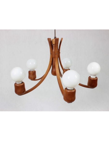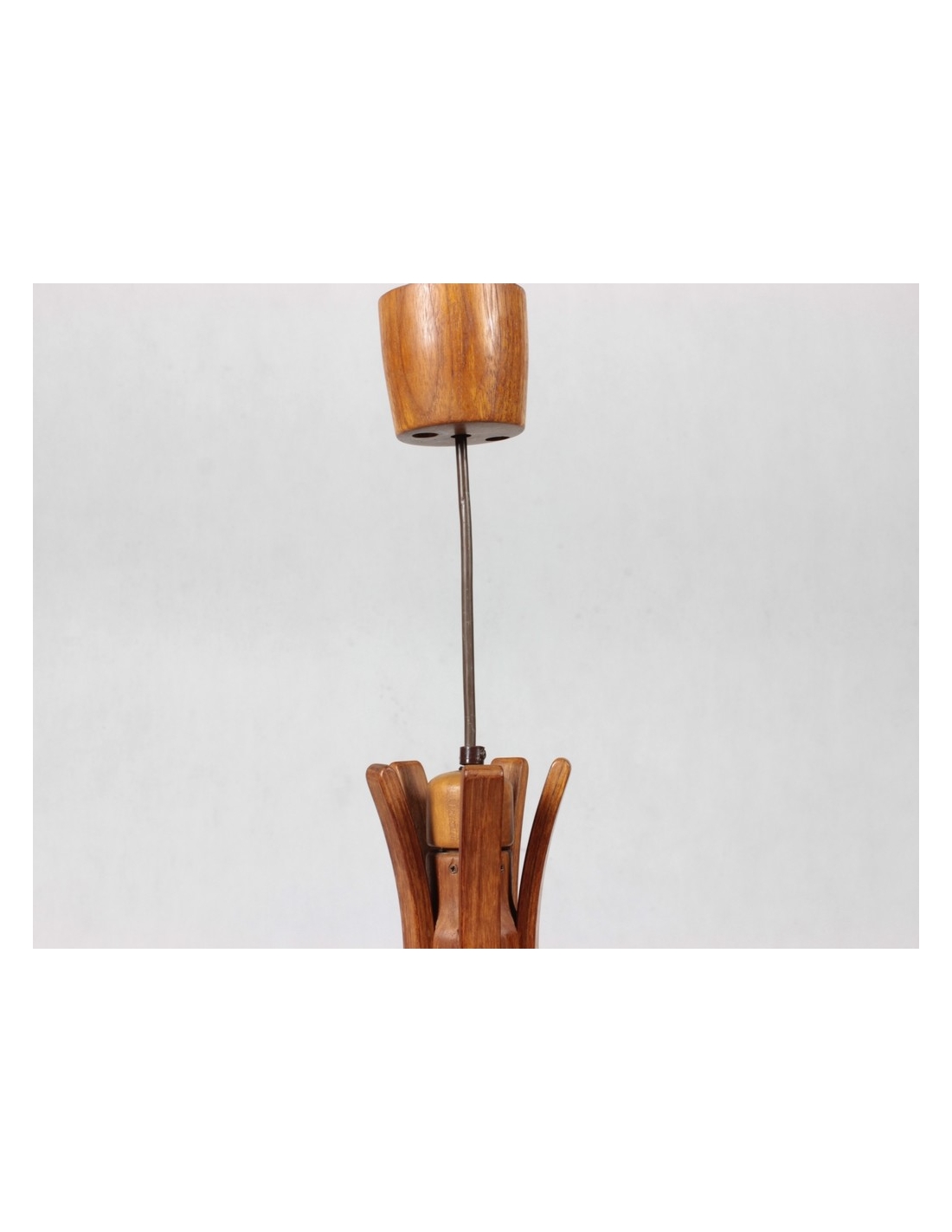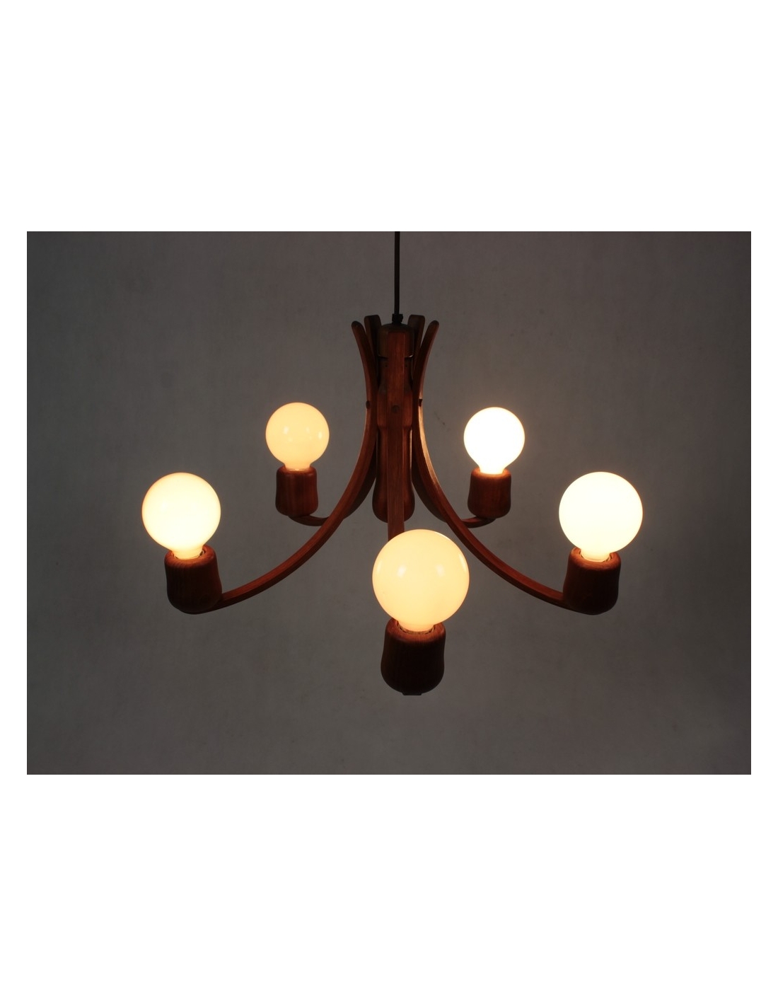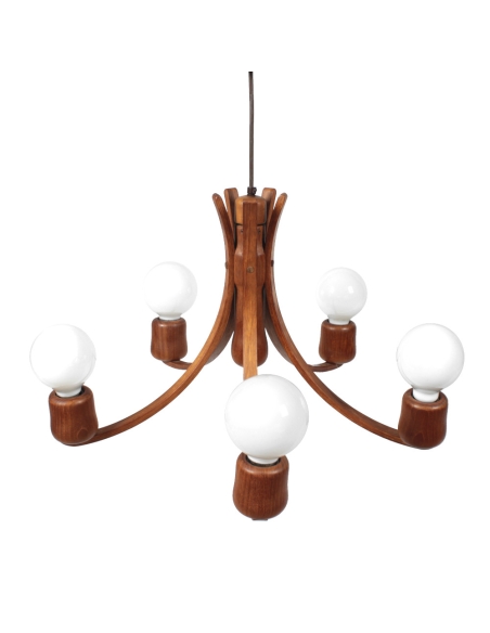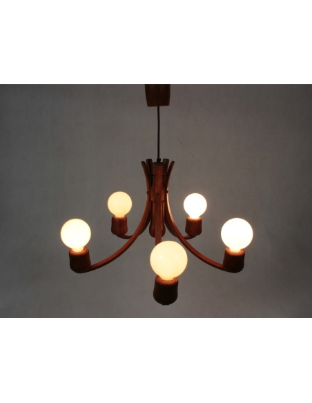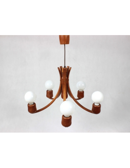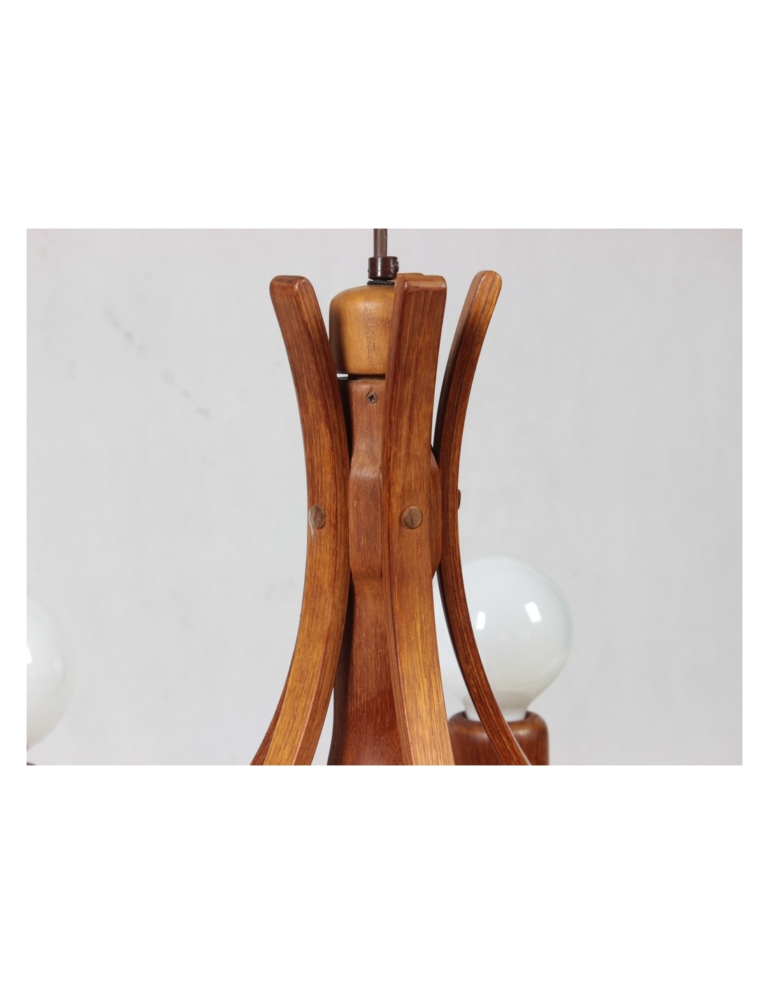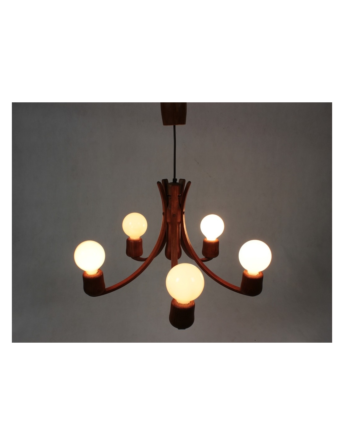 Żyrandol wykonany jest z drewna tekowego, został wyprodukowany w Danii latach 60. Zachowana została dbałość o najmniejsze szczegóły, jak zatyczki śrub, czy podsufitka, które również wykonane zostały z drewna. Żyrandol posiada możliwość regulacji wysokości zwisu ze względu na zastosowaną długość przewodu.