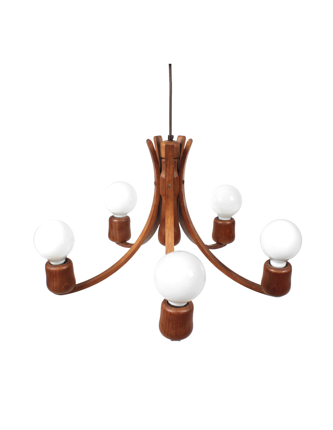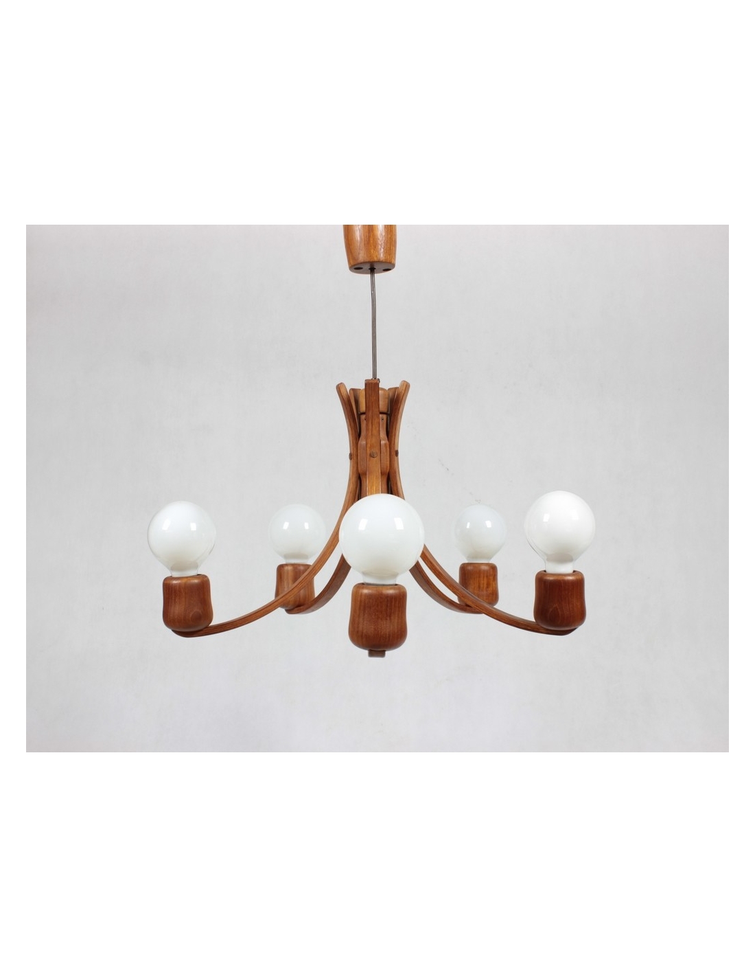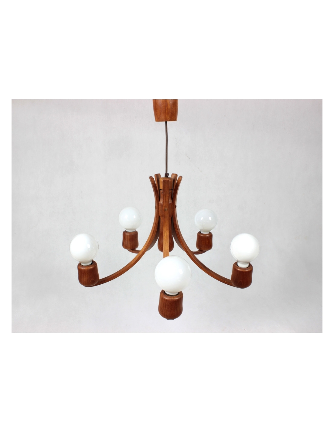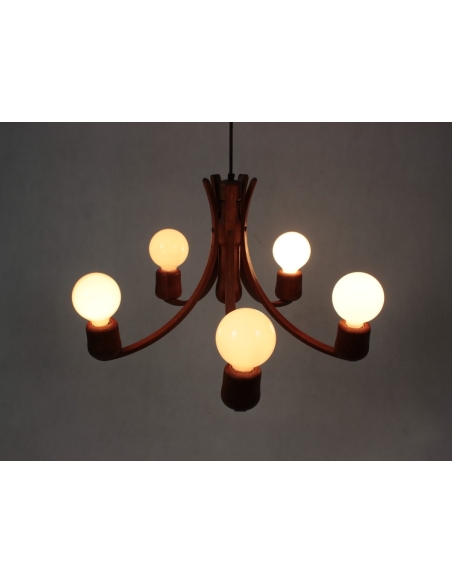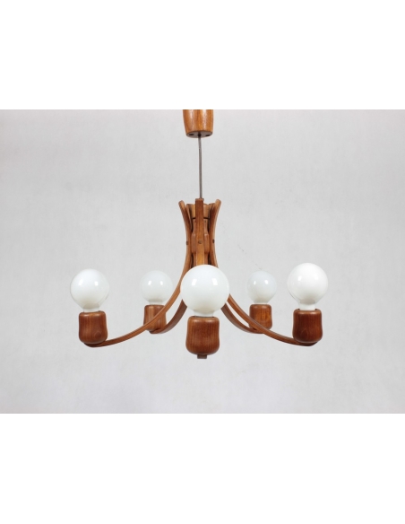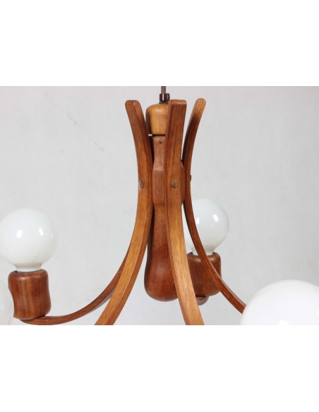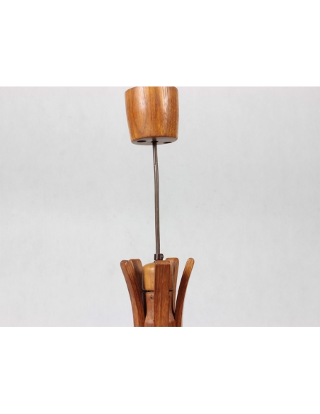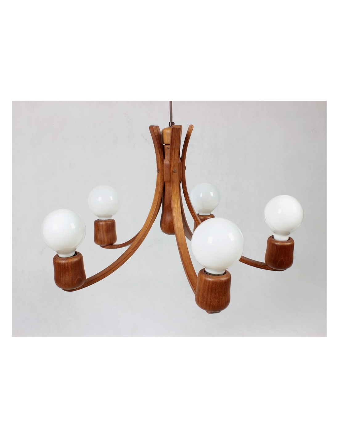 Żyrandol wykonany jest z drewna tekowego, został wyprodukowany w Danii latach 60. Zachowana została dbałość o najmniejsze szczegóły, jak zatyczki śrub, czy podsufitka, które również wykonane zostały z drewna. Żyrandol posiada możliwość regulacji wysokości zwisu ze względu na zastosowaną długość przewodu.