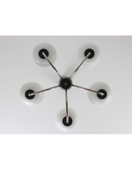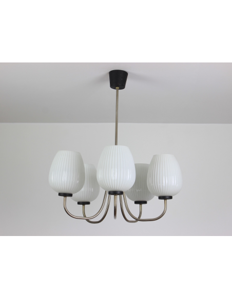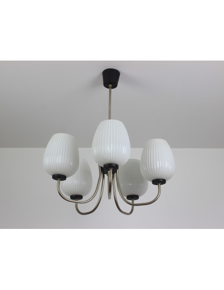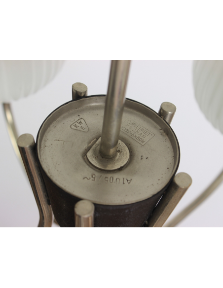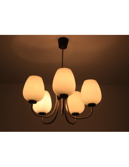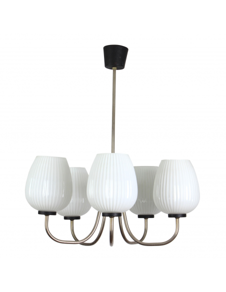 Żyrandol pochodzący z lat 60-tych, wyprodukowany w Polsce. Sygnowany Lumet Poznań. Klosze z mlecznego szkła. Żyrandol posiada naturalny nalot, który zdecydowanie dodaje mu uroku. Urządzenie sprawne.