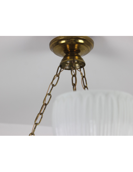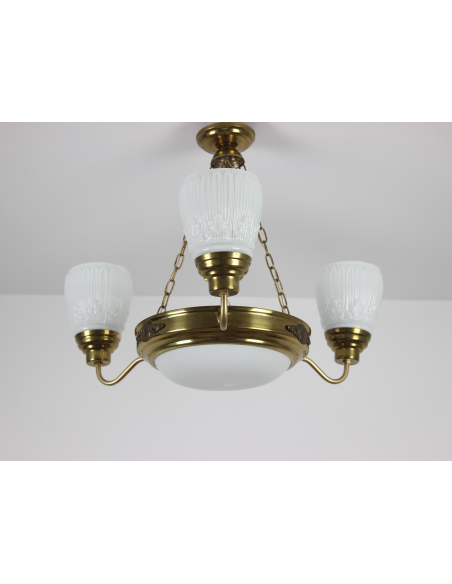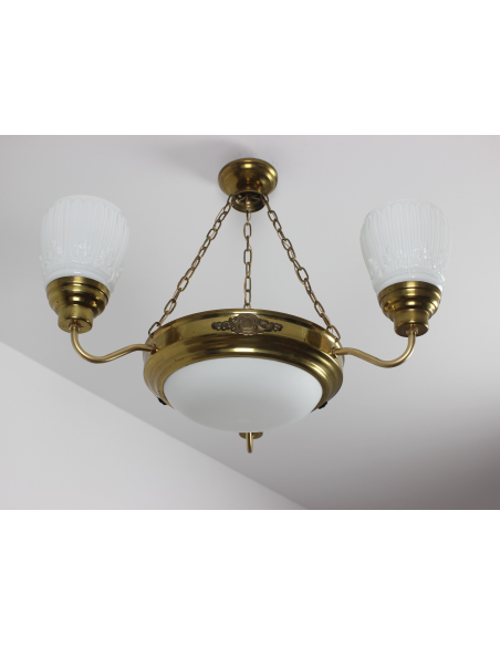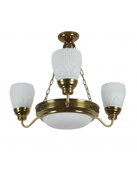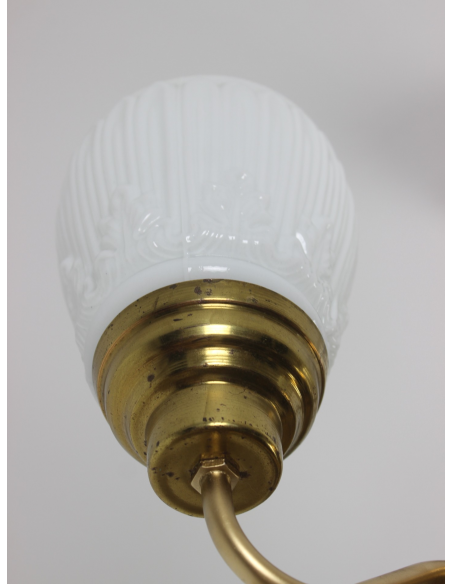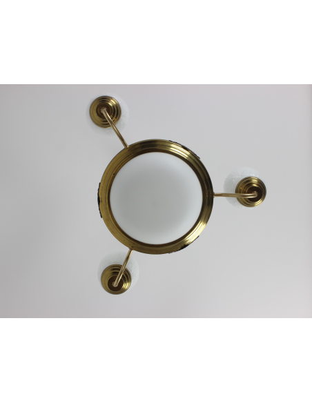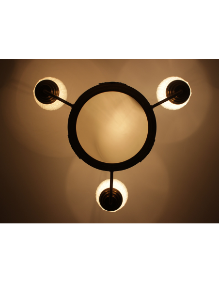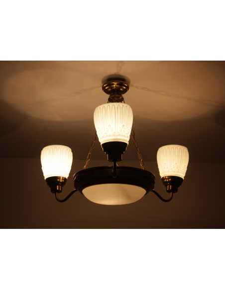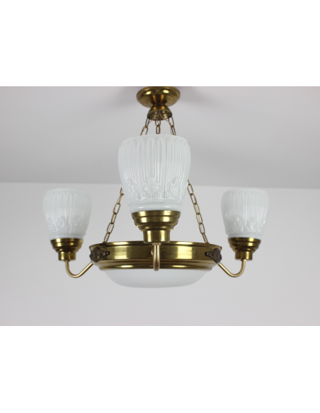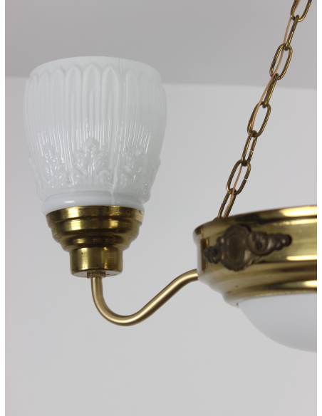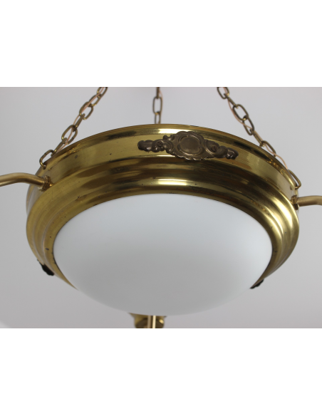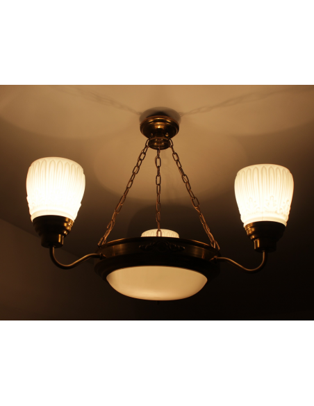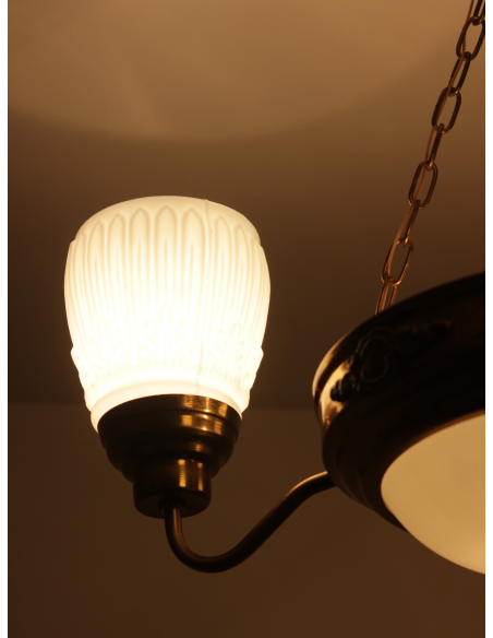 Lampa wisząca pochodząca z lat 60. Wykonana ze stali, klosze z grubego mlecznego szkła. Możliwość zapalenia trzech ramion, samej ampli lub wszystkich czterech punktów świetlnych jednocześnie. Lampa posiada naturalny nalot powstały w wyniku upływu lat.