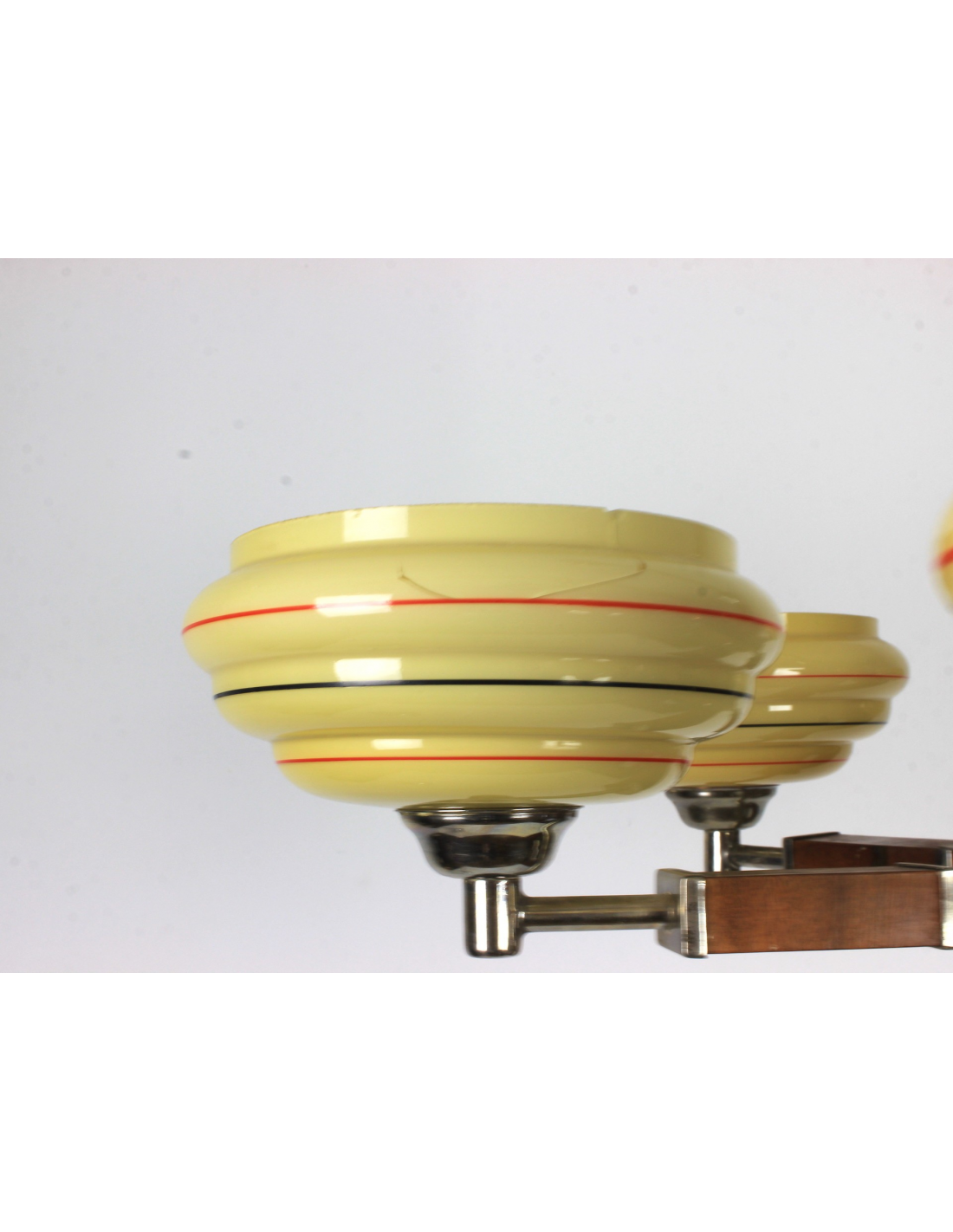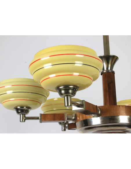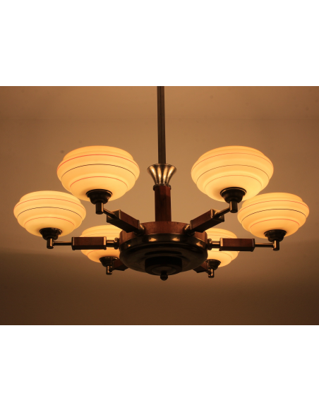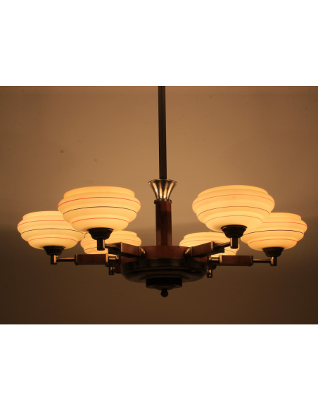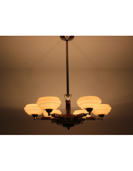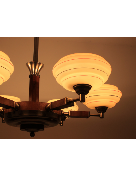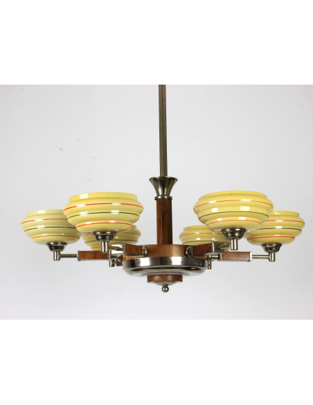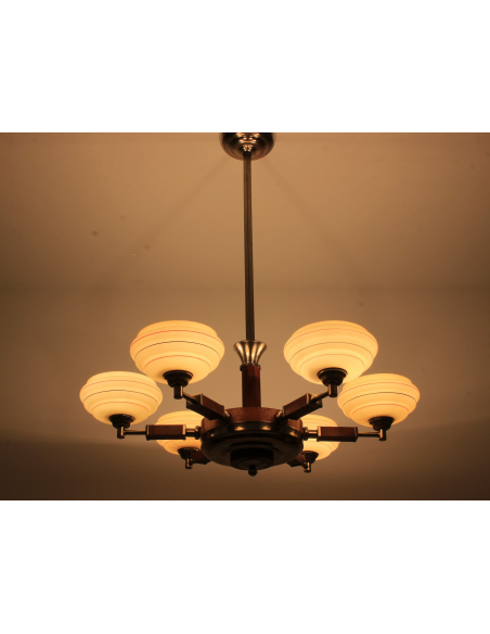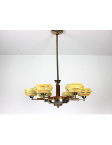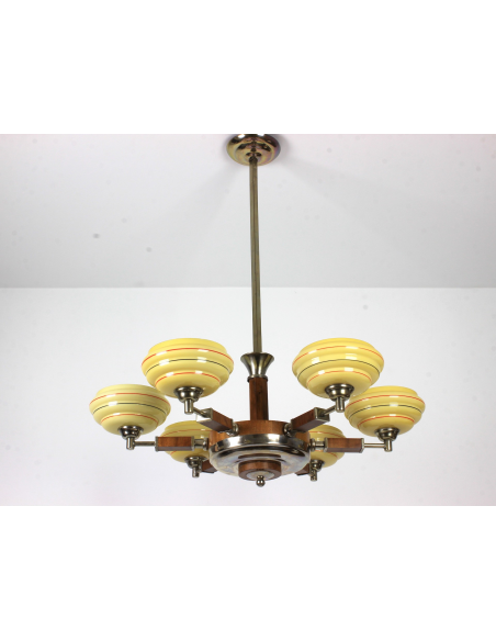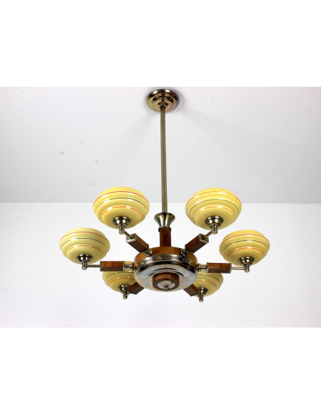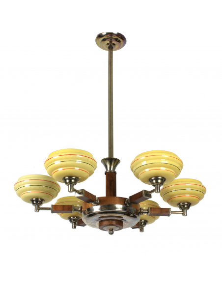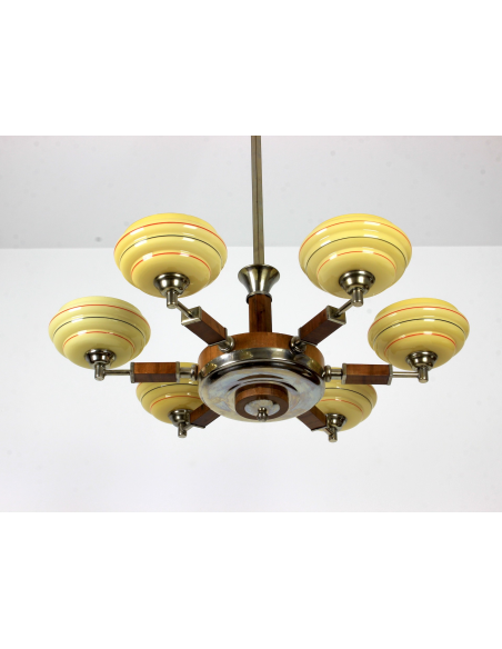 Żyrandol pochodzący z lat 30. Klasyczny przykład stylu art deco. Wykonany z drewna oraz elementów z chromowanego mosiądzu. Charakteryzuje się bardzo ciekawą formą. Prawdziwy unikat. Jeden z kloszy posiada pęknięcie. Element nie odpadł, nie był klejony, znajduje się w górnej części klosza także pod sufitem nie jest widoczny. Defekt ujęty na zdjęciach.